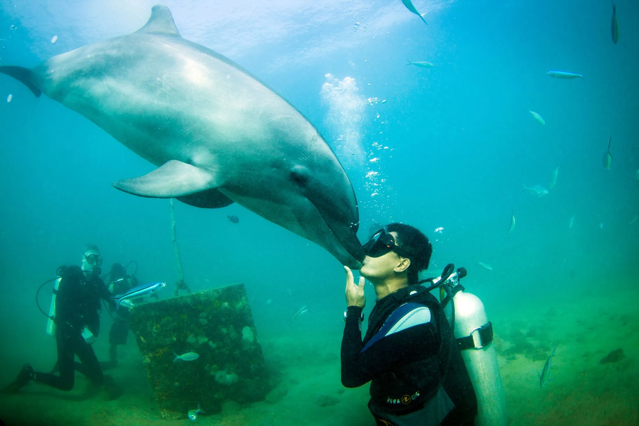 This is the incredible moment a friendly dolphin planted an affectionate kiss on a lucky diver. (Photo by Caters News)