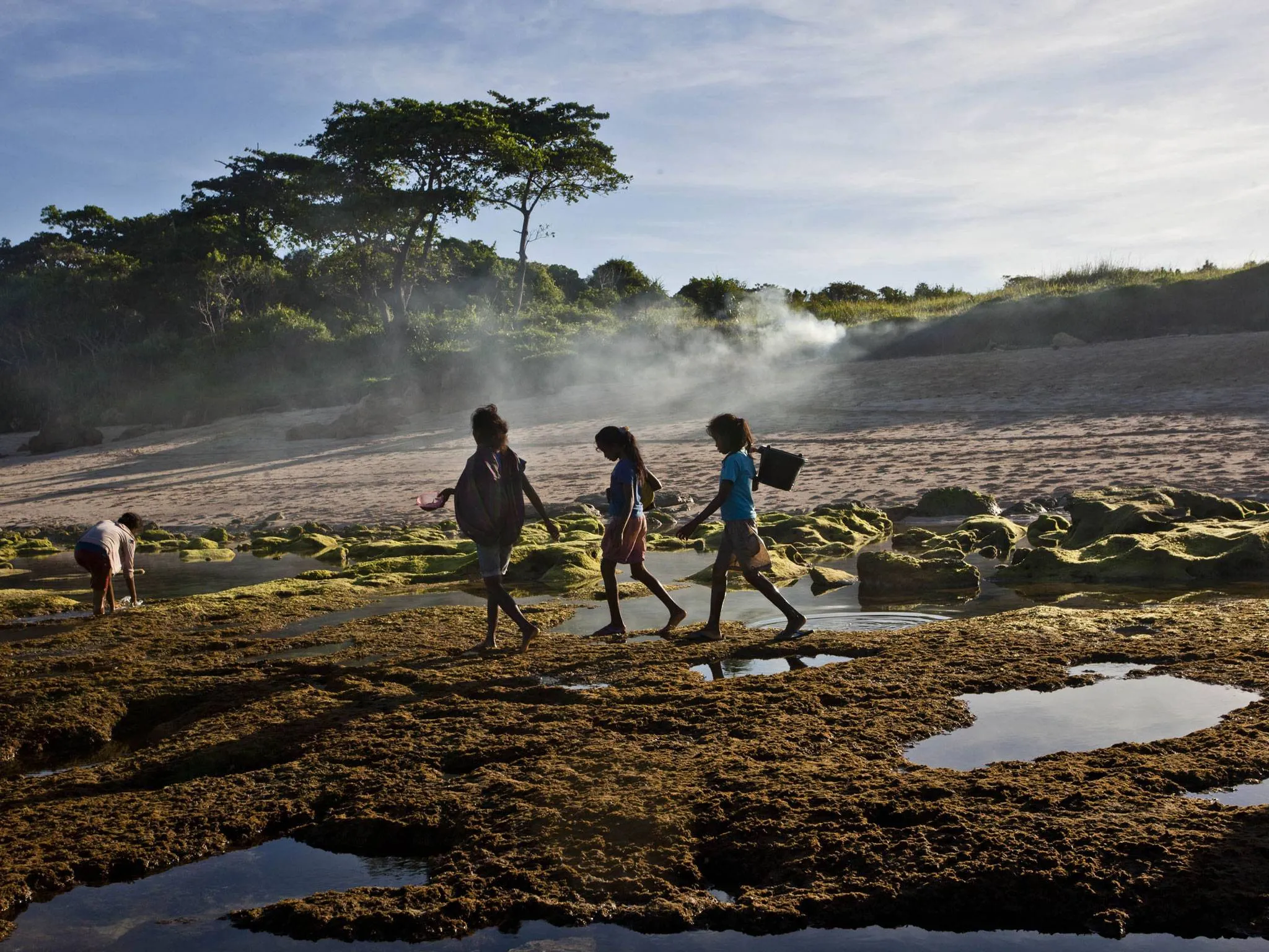 Sumbanese people walks to their village after collect the sea worms during Nyale ritual as part of the Pasola war festival at Wainyapu village in Sumba Island. The Pasola Festival is an important annual event to welcome the new harvest season, which coincides with the arrival of “Nyale” sea worms during February or March each year. (Photo by Ulet Ifansasti/Getty Images)