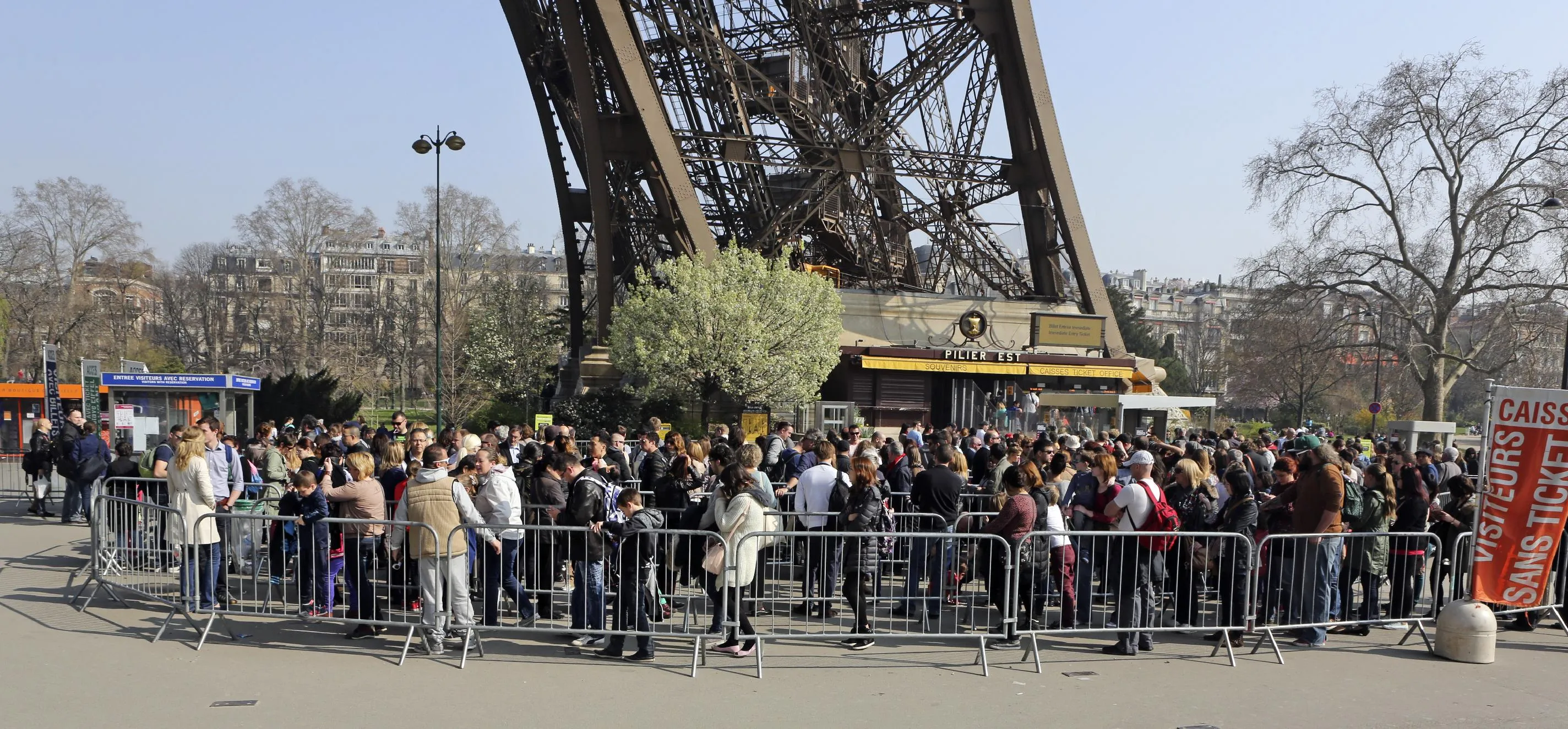 Tourists wait in line at the foot of the Eiffel Tower in Paris, Thursday March 13, 2014. Lines stretch for hours, leaving visitors to bake in the summer or soak in the rain for fear of losing their place. Socialist candidate for Paris mayor Anne Hidalgo wants to create an underground welcome area and rethink how people visit France's most popular monument. (Photo by AP Photo/Remy de la Mauviniere)