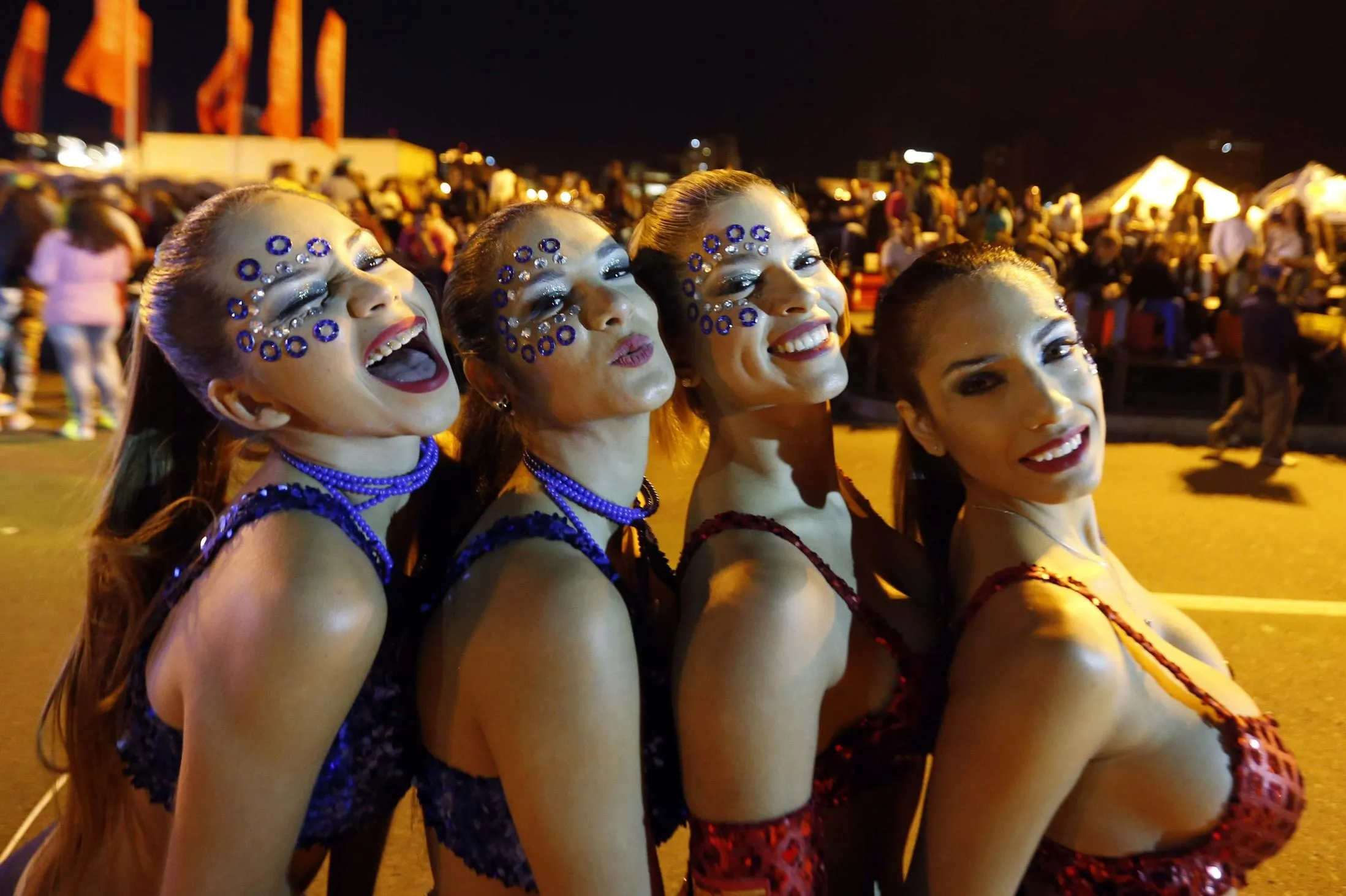 Staff members of the organising company pose before the annual Carnaval in Asuncion, on March 22, 2014. (Photo by Jorge Adorno/Reuters)