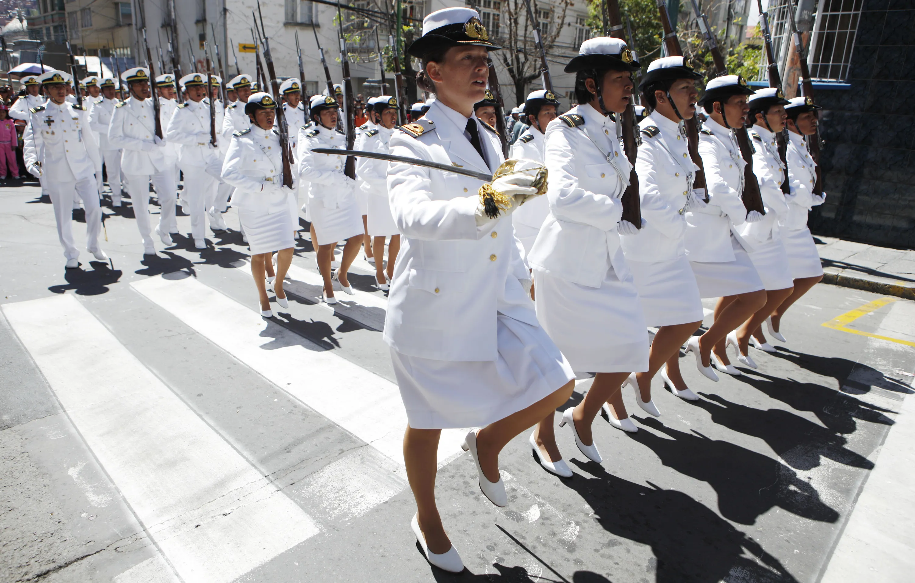 Naval officers march in the parade honoring Abaroa, who died in the 1879-1884 War of the Pacific, as part of Sea Day celebrations in La Paz, Bolivia, on March 23, 2014. Bolivia lost its access to the Pacific due to Chile's victory in the war that gave Chile mineral-rich territories once held by Peru and Boliva. (Photo by Juan Karita/Associated Press)
