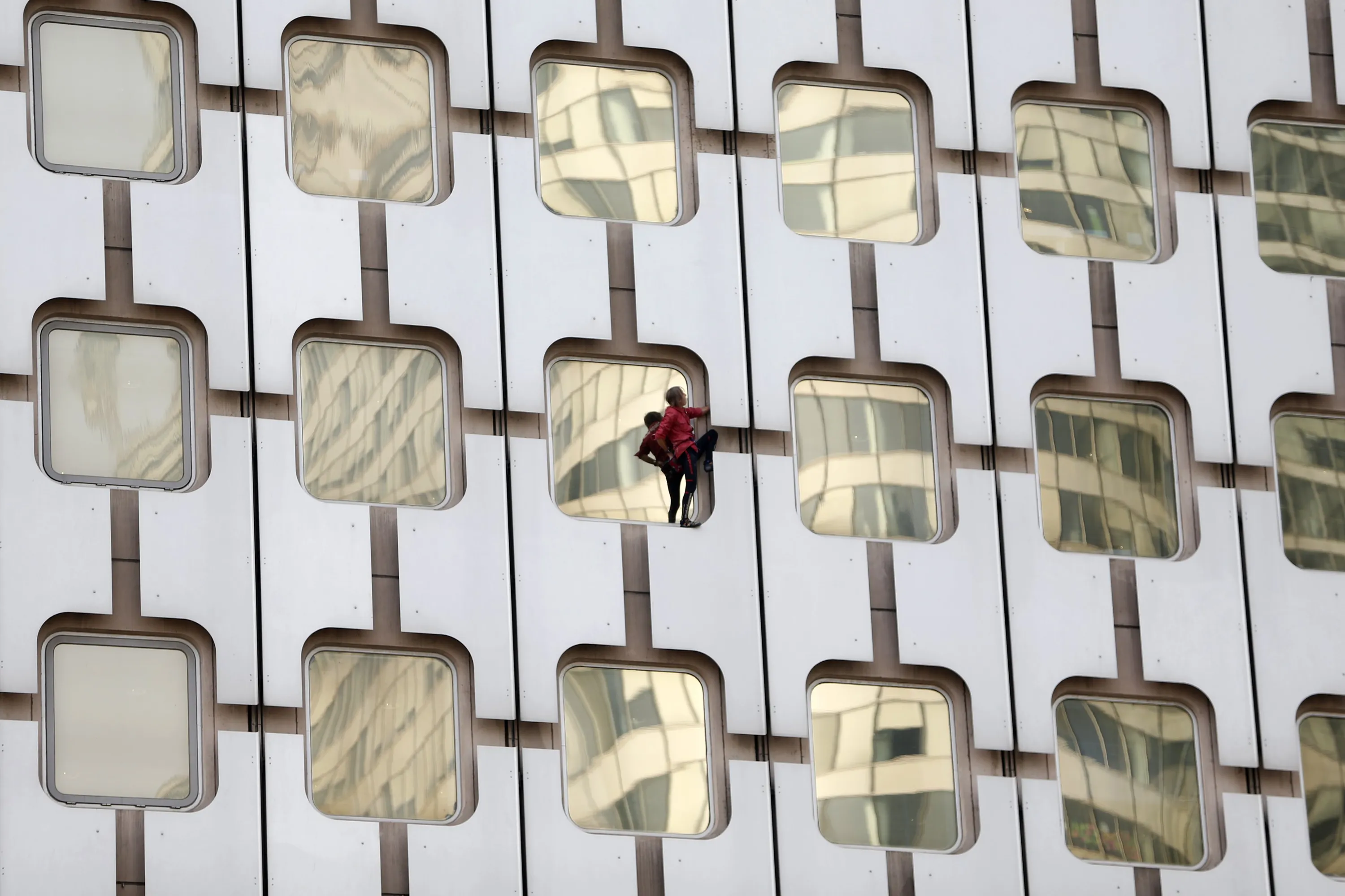 French climber Alain Robert, also known as “Spiderman”, scales the 152 metre Ariane Tower at La Defense financial and business district outside Paris March 27, 2014. (Photo by Charles Platiau/Reuters)