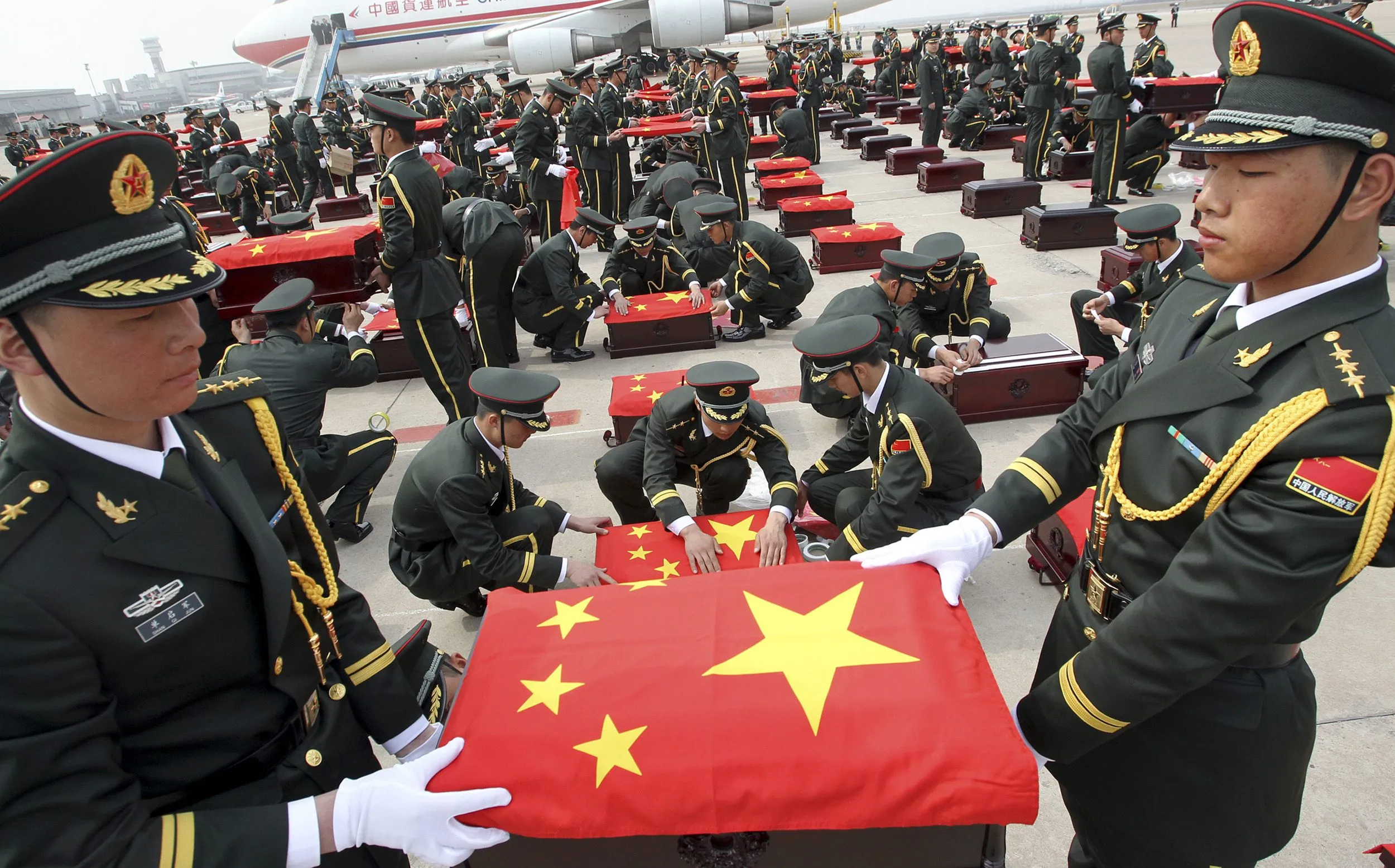 Soldiers of the Chinese People's Liberation Army (PLA) hold caskets containing the remains of soldiers of the Chinese People's Volunteers (CPV) in Shenyang, Liaoning province, March 28, 2014. The remains of 437 Chinese soldiers killed during the 1950-53 Korean War returned to China from a temporary columbarium in South Korea. (Photo by Reuters/China Daily)