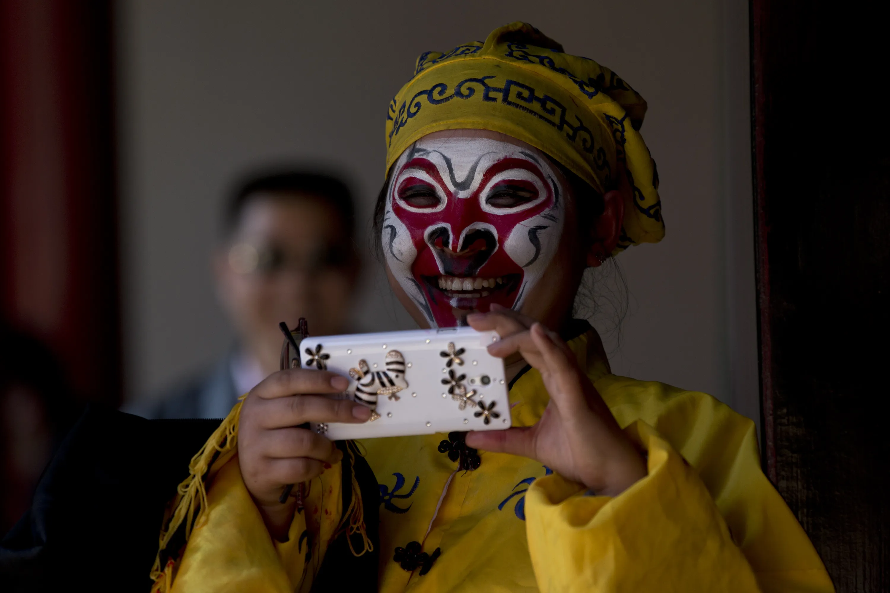 A Peking opera performer uses her mobile photo to take photos after she performed for visiting U.S. first lady Michelle Obama at the Summer Palace in Beijing, Saturday, March 22, 2014. (Photo by Alexander F. Yuan/AP Photo)