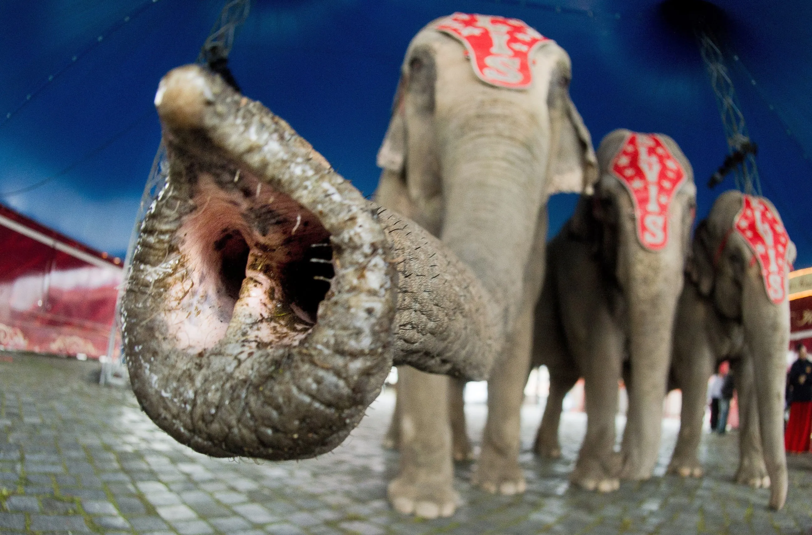 A curious elephant holds its trunk in front of the camera during the press event for the Circus Charles Knie in Hanover, Germany, March 24, 2014. The circus, with its 110 animals and 100 employees, will be in Hanover until April 6th. (Photo by Julian Stratenschulte/EPA)