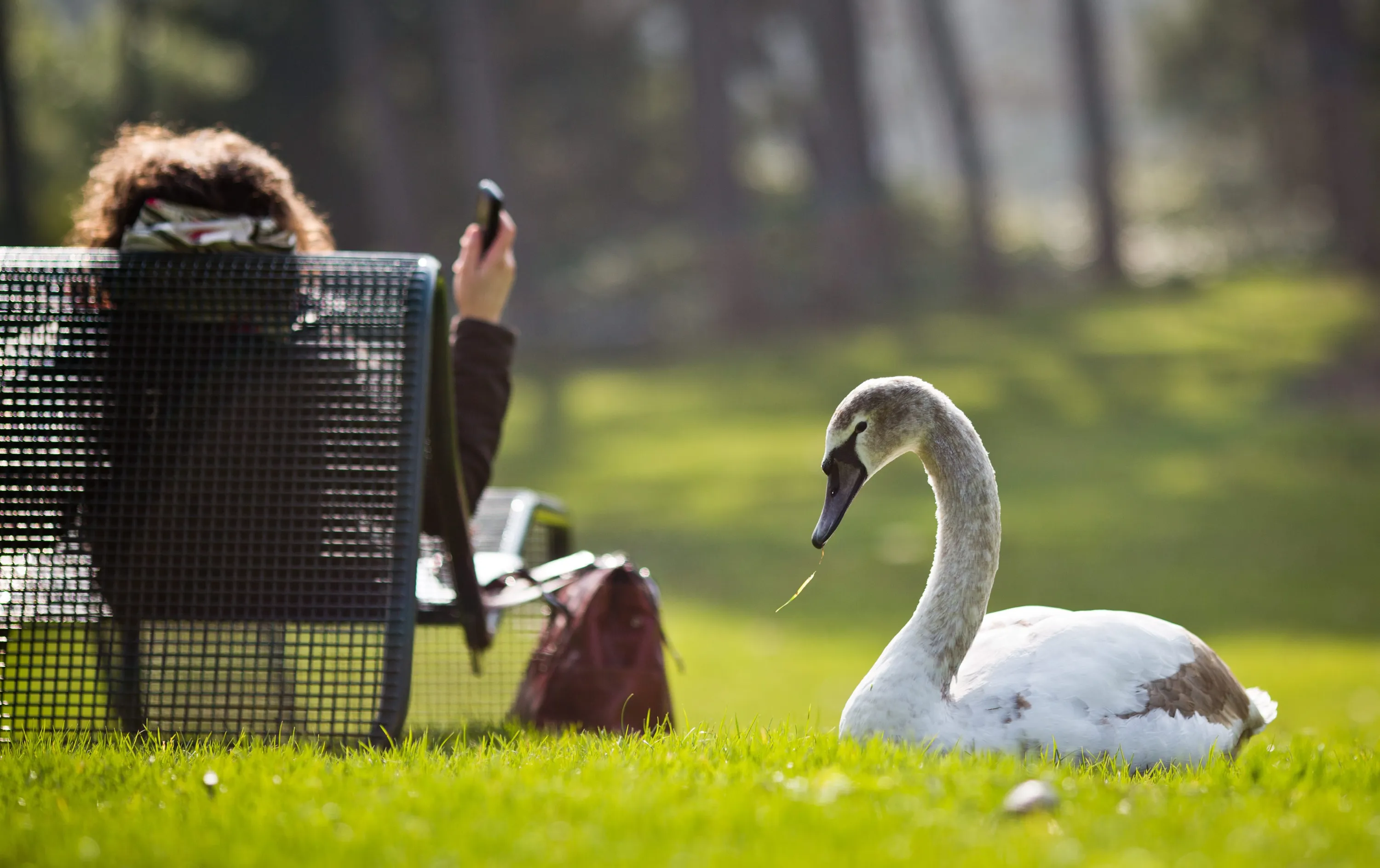 A young swan sits next to a woman on a lawn in the Spring temperatures in the Palmengarten in Frankfurt Main, Germany, 07 March 2014. (Photo by Frank Rumpenhorst/EPA)