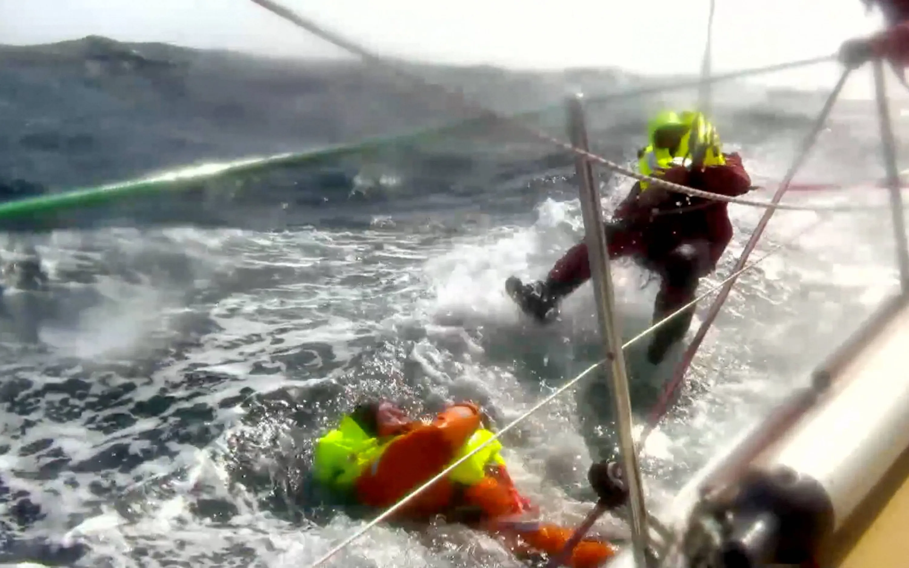 This Monday, March 31, 2014 image provided by Clipperroundtheworld.com shows Andrew Taylor, 46, left, from London during his rescue after falling overboard from the 70-foot yacht, the Derry-Londonderry-Doire, during the Clipper Round the World Yacht Race. Taylor spent nearly two hours in the cold, rough North Pacific and says he never gave up hope of being rescued because he knew his fellow crew members were well-trained for such an emergency. (Photo by AP Photo/Clipperroundtheworld.com)