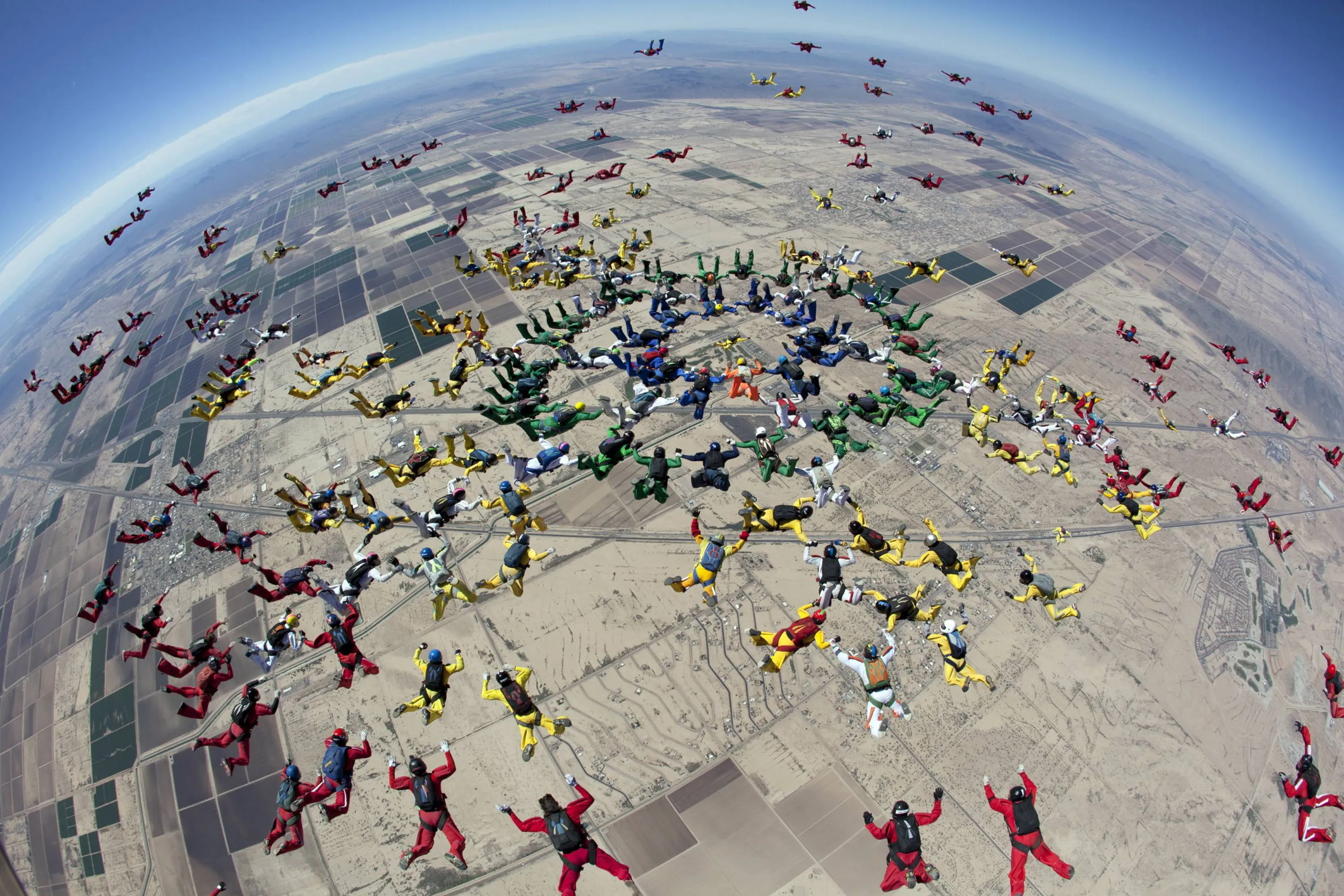 In this Tuesday, April 1, 2014 photo provided by The World Team, a group of 222 skydivers from 28 nations, team members dive over Eloy, Ariz. The jump was part of the group's ongoing attempt to set a world record by forming two distinct aerial formations within the same dive. The team did not break the record with this attempt. (Photo by Andrey Veselov/AP Photo/World Team)