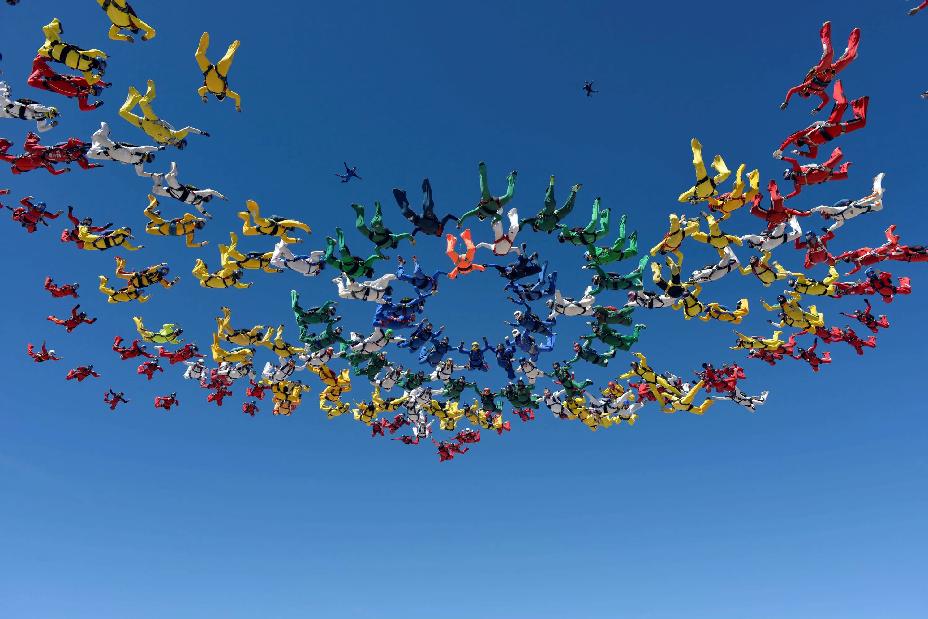 Members of the World Team join together in a missing man formation during a jump over Eloy, Ariz., Thursday, April 3, 2014, after one of the group died during a jump earlier in the day. The accident occurred as the group tried to set a world record by forming two distinct aerial formations within the same dive earlier Thursday morning. Skydive Arizona blamed the accident on a malfunctioning parachute that was released too low to the ground to allow a reserve parachute to fully open. (Photo by Henny Wiggers/AP Photo/World Team)