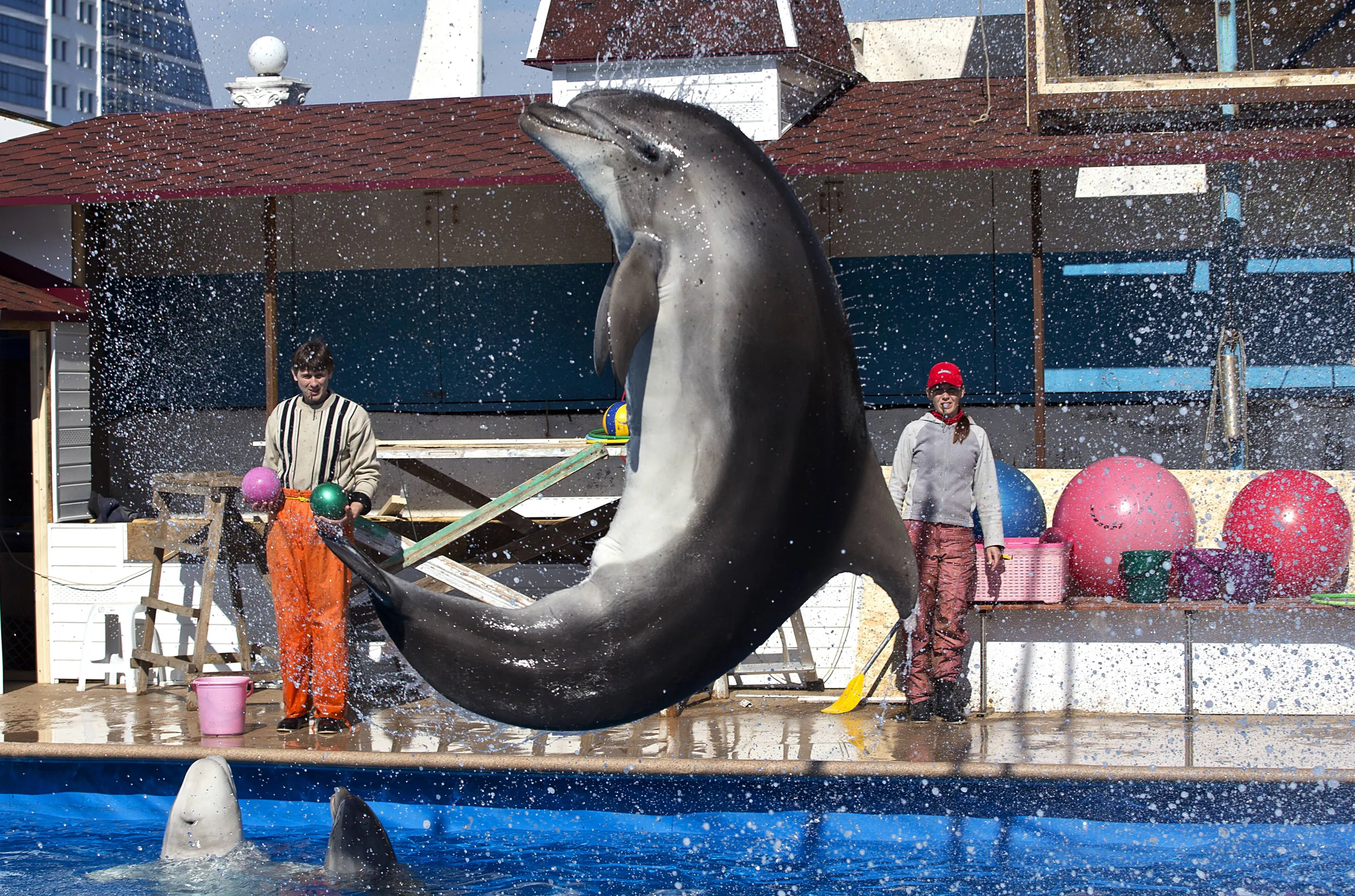Employees of the Sevastopol State Oceanarium train dolphins, in Sevastopol, Crimea, Sunday, March 30, 2014. A Soviet-era military program training dolphins and seals for combat will be revived in Crimea after its annexation by Russia, according to Russian state media. (Photo by Pavel Golovkin/AP Photo)