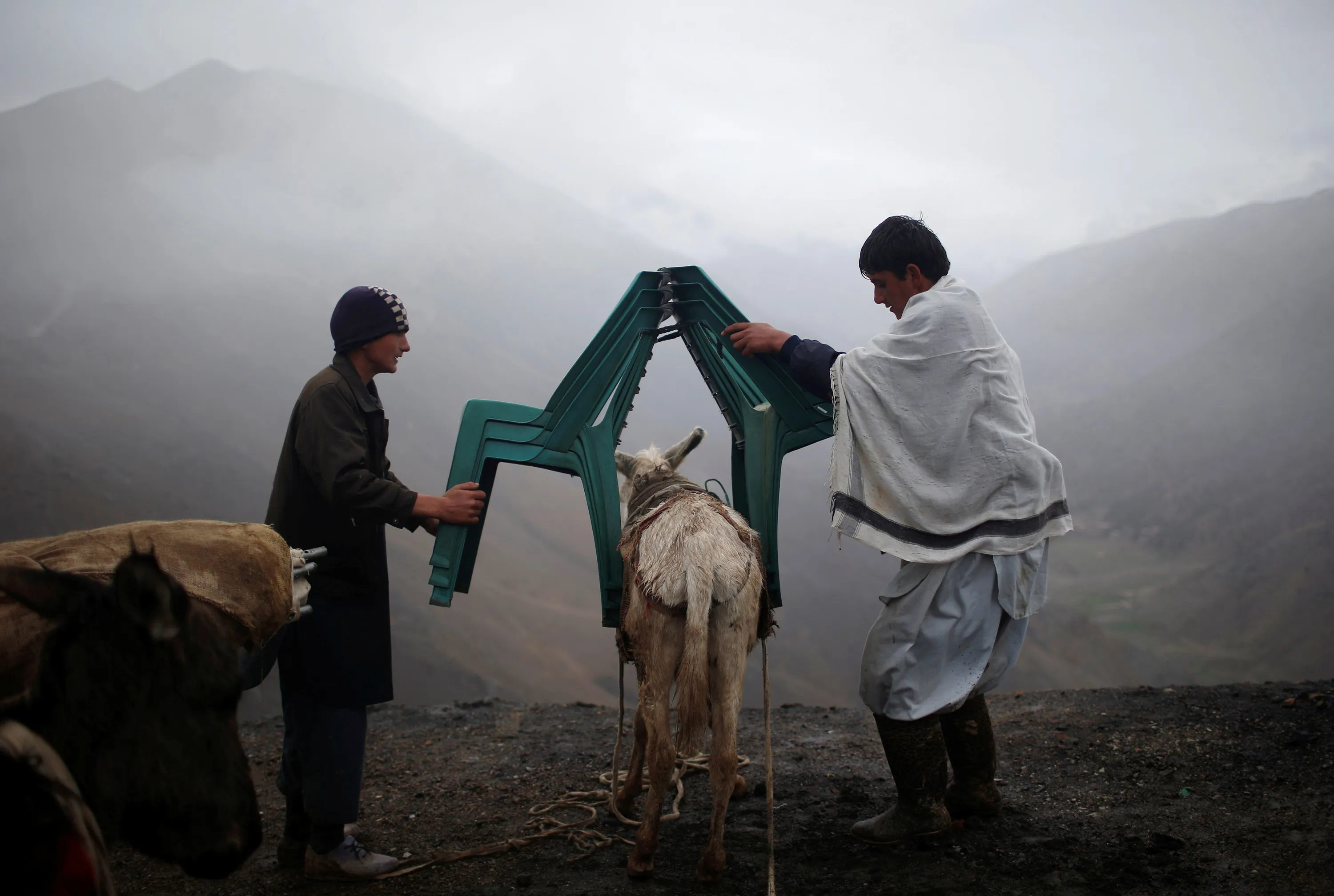 Afghan men load chairs on a donkey as they prepare to transport ballot boxes and other election material to polling stations which are not accessible by road in Shutul, Panjshir province, April 4, 2014. The Afghan presidential elections will be held on April 5. (Photo by Ahmad Masood/Reuters)