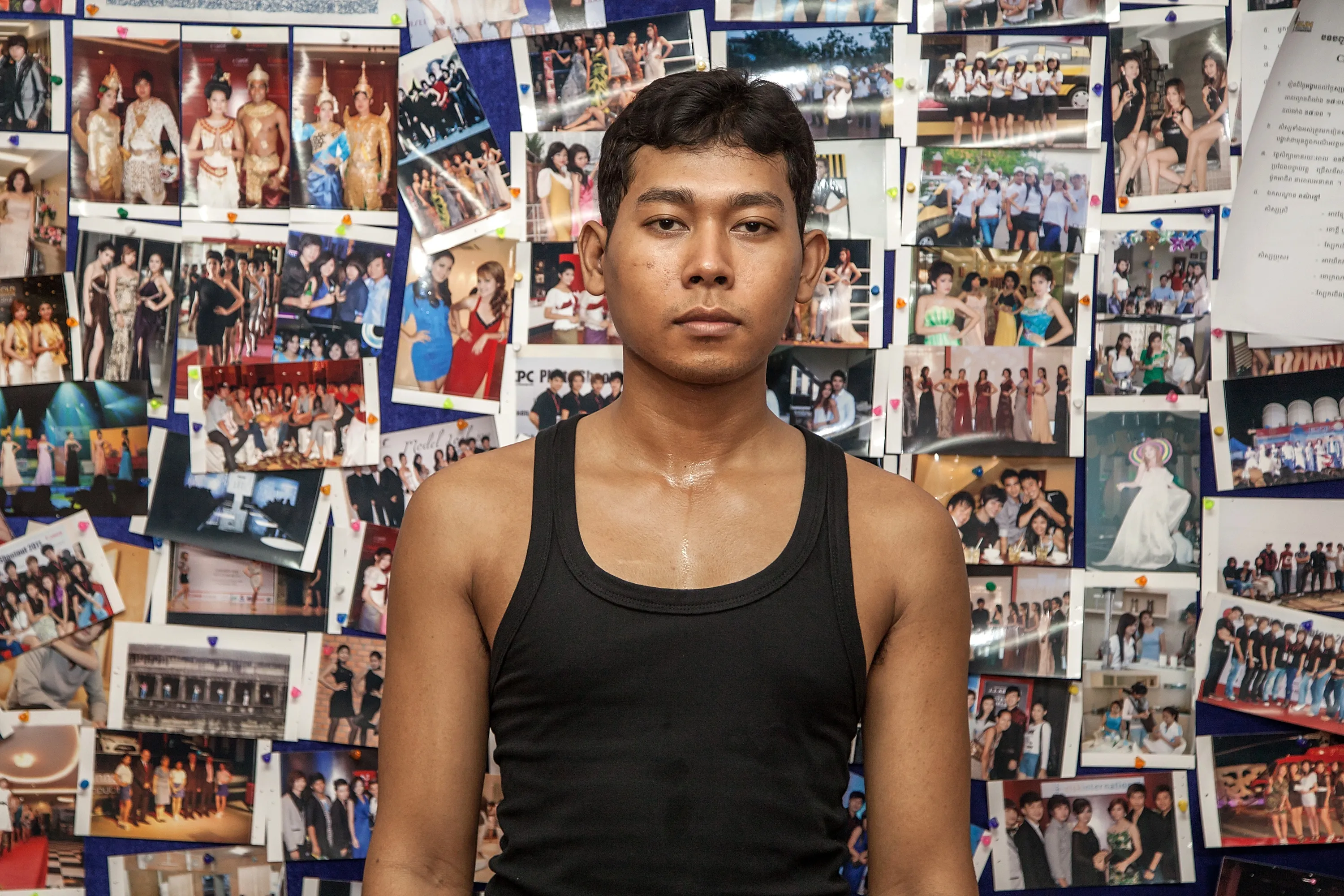 A male Sun Model student poses in front of a wall of photographs from the agency's previous shows during training at the fashion school on March 31, 2014 in Phnom Penh, Cambodia. (Photo by Omar Havana/Getty Images)