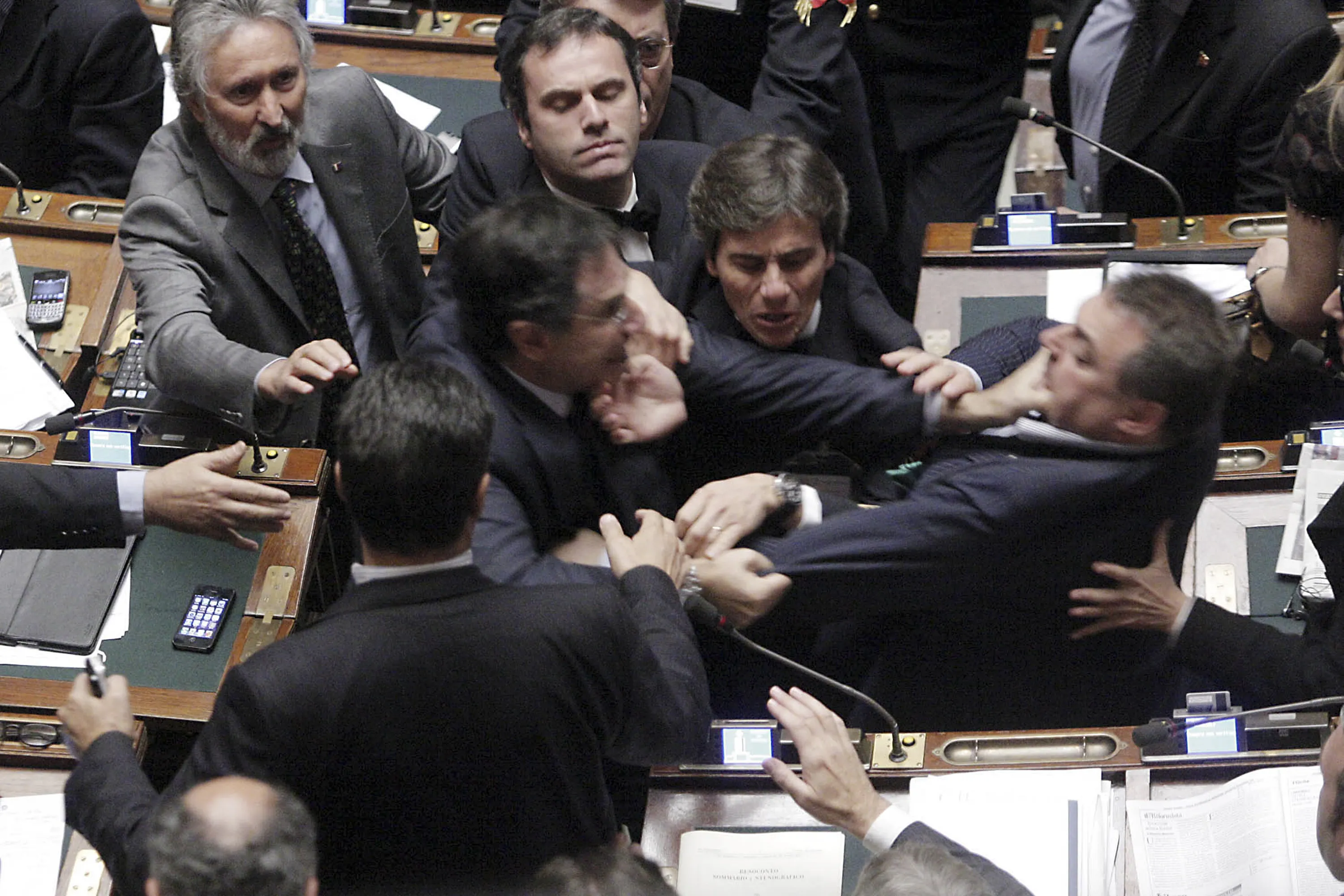 Claudio Barbato (L), a member of the opposition FLI party, fights with Fabio Ranieri (R) from the Northern League in Parliament in Rome October 26, 2011. (Photo by Giuseppe Lami/Reuters)