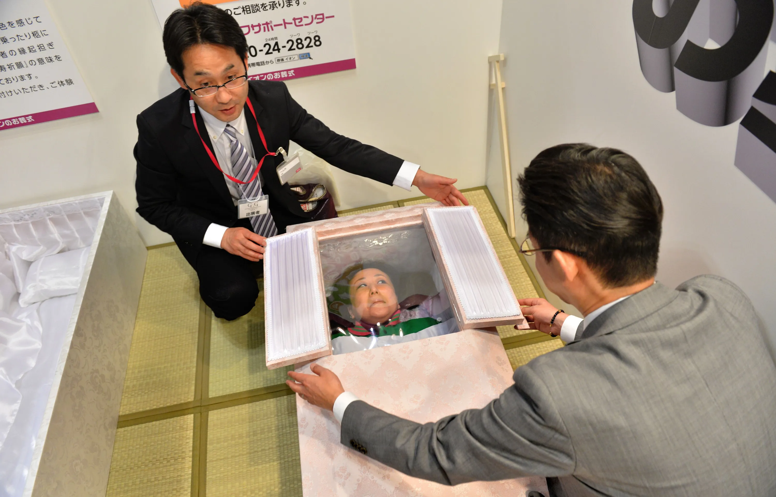 A woman lies in a coffin at a funeral fair in the Grand Generation's Collection 2014 produced by Japanese retailer Aeon in Makuhari on April 11, 2014. The three-day collection will be held until April 13. (Photo by Kazuhiro Nogi/AFP Photo)