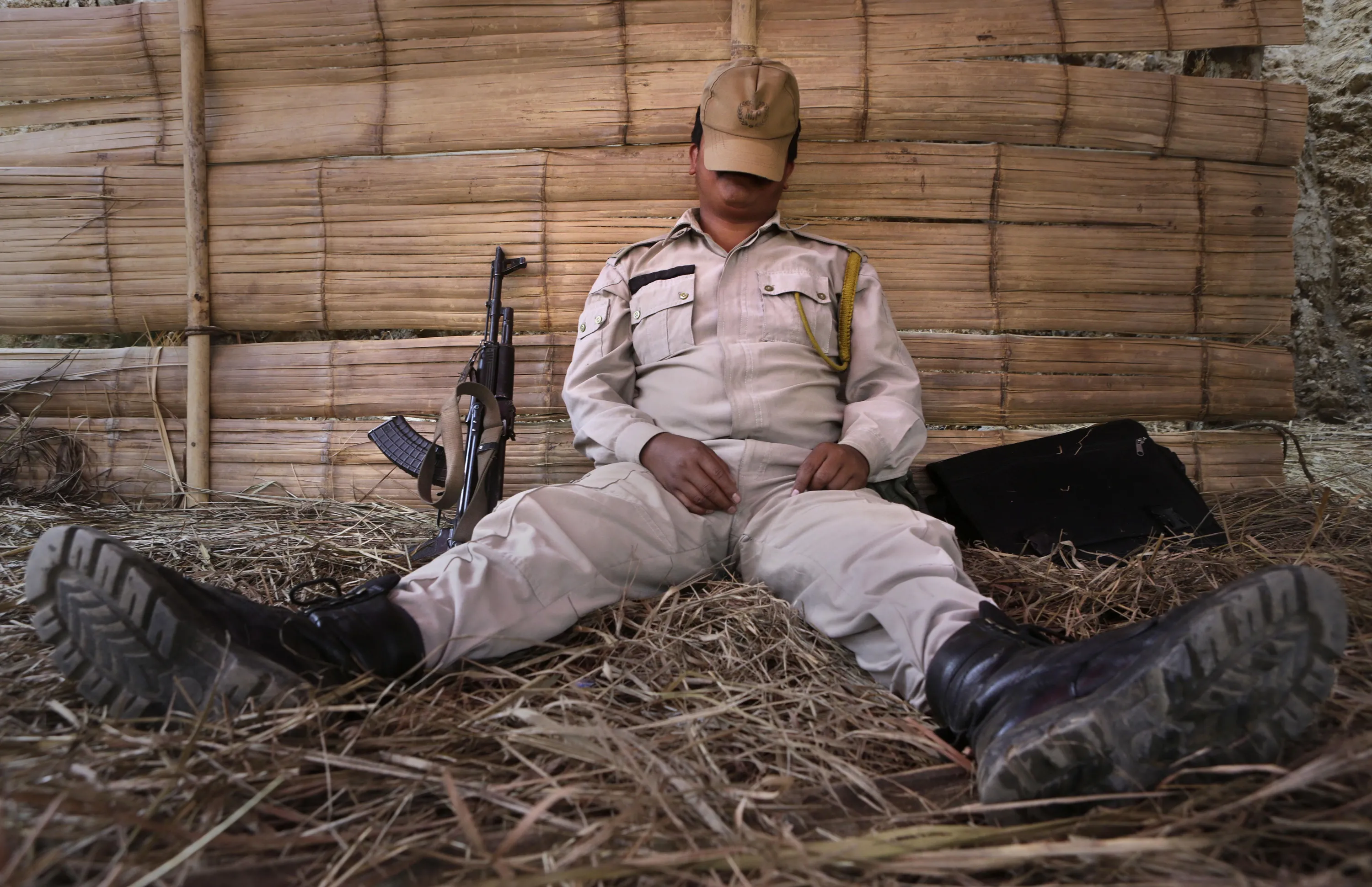 A security man rests at an electronic voting machine distribution center on the eve of the second phase of Indian parliamentary elections at Senapati, in north eastern Manipur state, India, Tuesday, April 8, 2014. India started the world's largest election Monday where the country's 814 million electorate will vote in stages over the next five weeks. (Photo by Anupam Nath/AP Photo)