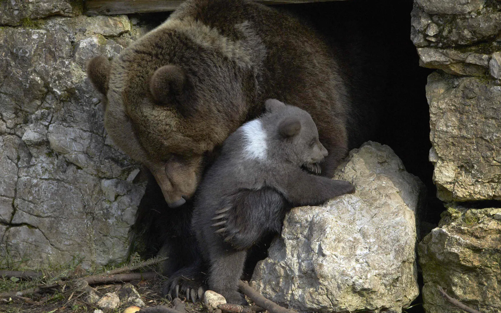 A brown bear cubs plays with it's mother Ursina in their enclosure at Juraparc animal park near Vallorbe April 7, 2014. Ursina, an 18-year old female bear gave birth to two cubs, King and Zoe, the twelfth and thirteenth cubs of the park, on an unknown date in January 2014. The parent bears were separated before the birth to avoid conflict between the father and cubs. (Photo by Denis Balibouse/Reuters)
