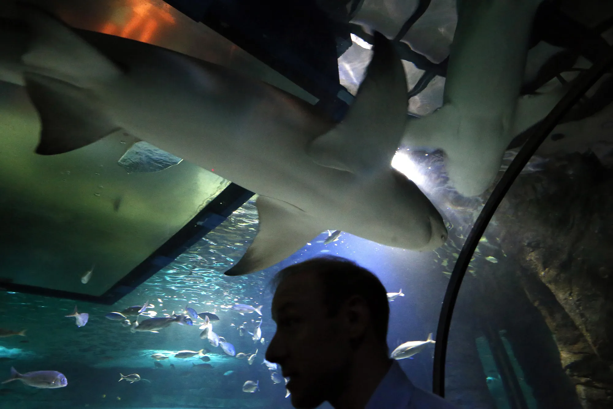 Sharks swim above shark attack policy researcher from the University of Sydney Christopher Neff at the Sydney Aquarium April 9, 2014. Australia ranks high in global charts of shark attacks and is currently running an aggressive culling drive against the marine predator, but a new survey conducted by Neff says many Australians aren't really that worried about them although the largest shark culling drive in the world is currently under way in Western Australia, where attacks are most common. Forty-five sharks have been killed there so far this year after being caught on baited drum lines the state government wants to extend for three years. (Photo by David Gray/Reuters)