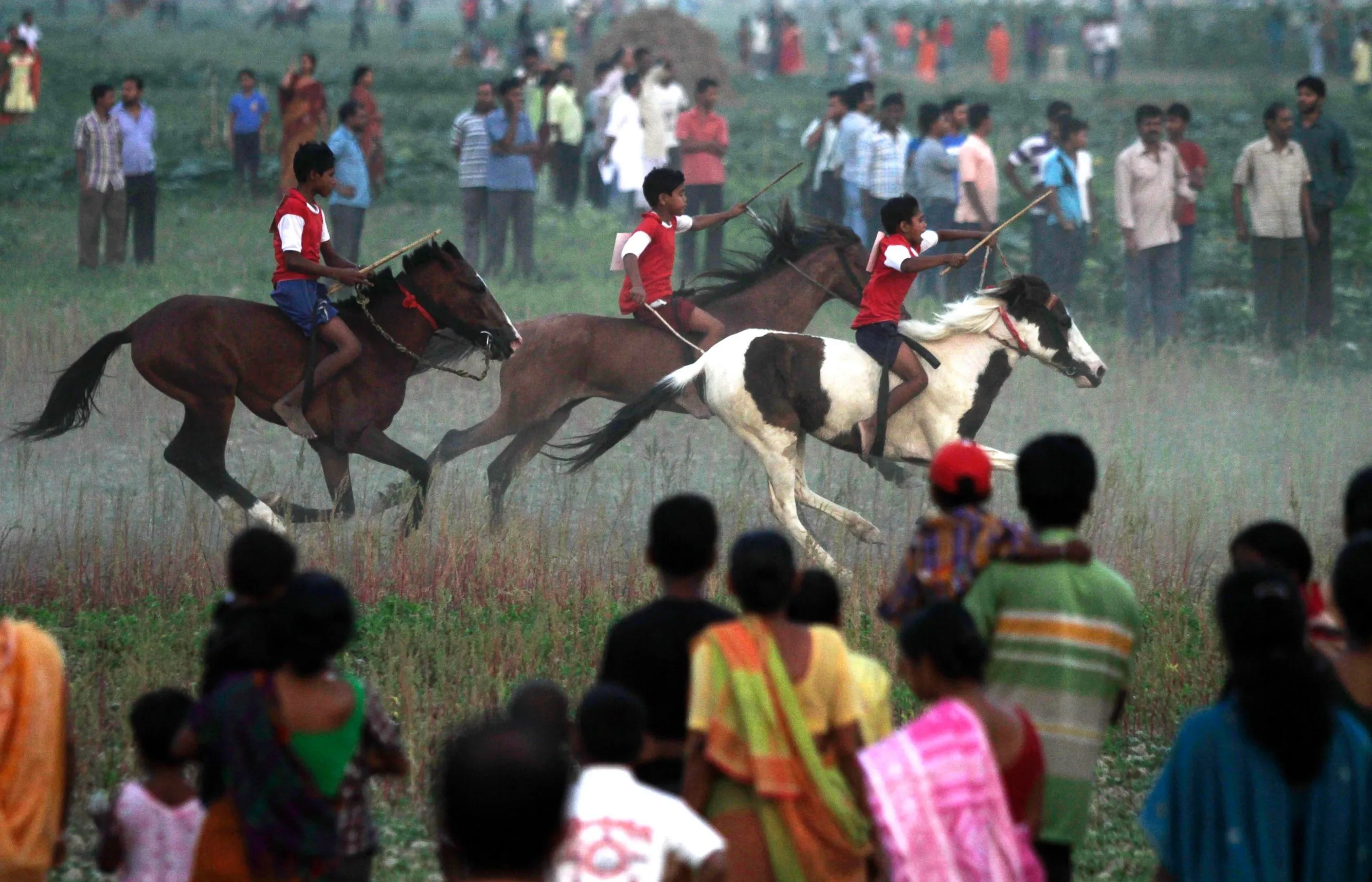 Indian boys ride horses through a vegetable field during a local horse race in Dakkhin Durgapur, about 30 kilometers south of Kolkata, India, April 5, 2014. The race is held as part of festivities to mark Sitala Puja, dedicated to the pox-Goddess Sitala. (Photo by Bikas Das/AP Photo)