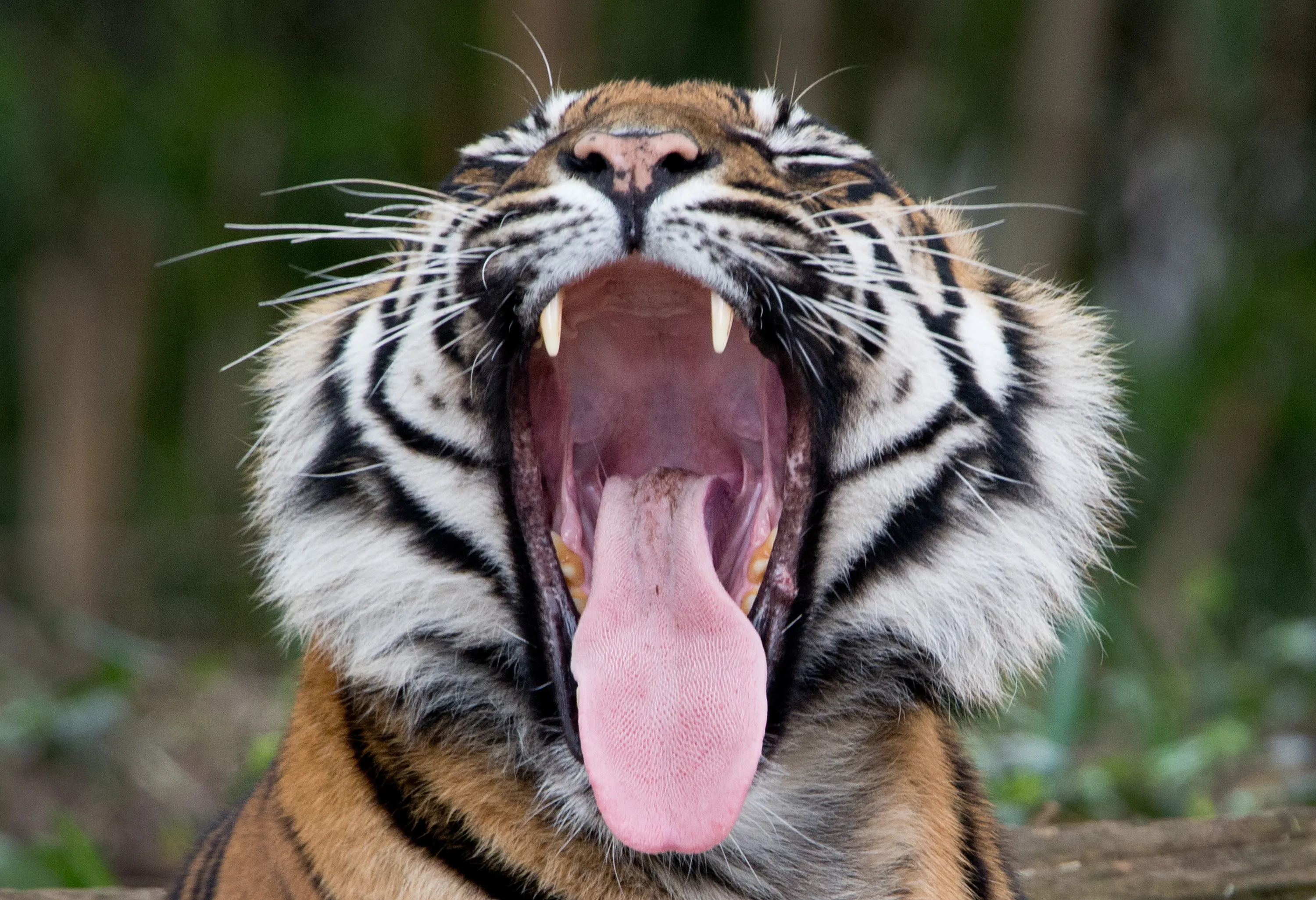 A tiger yawns in its open-air enclosure at the zoo of Frankfurt Main, Germany, April 10, 2014. The tigers are one of the zoo's most popular species. (Photo by Boris Roessler/EPA)