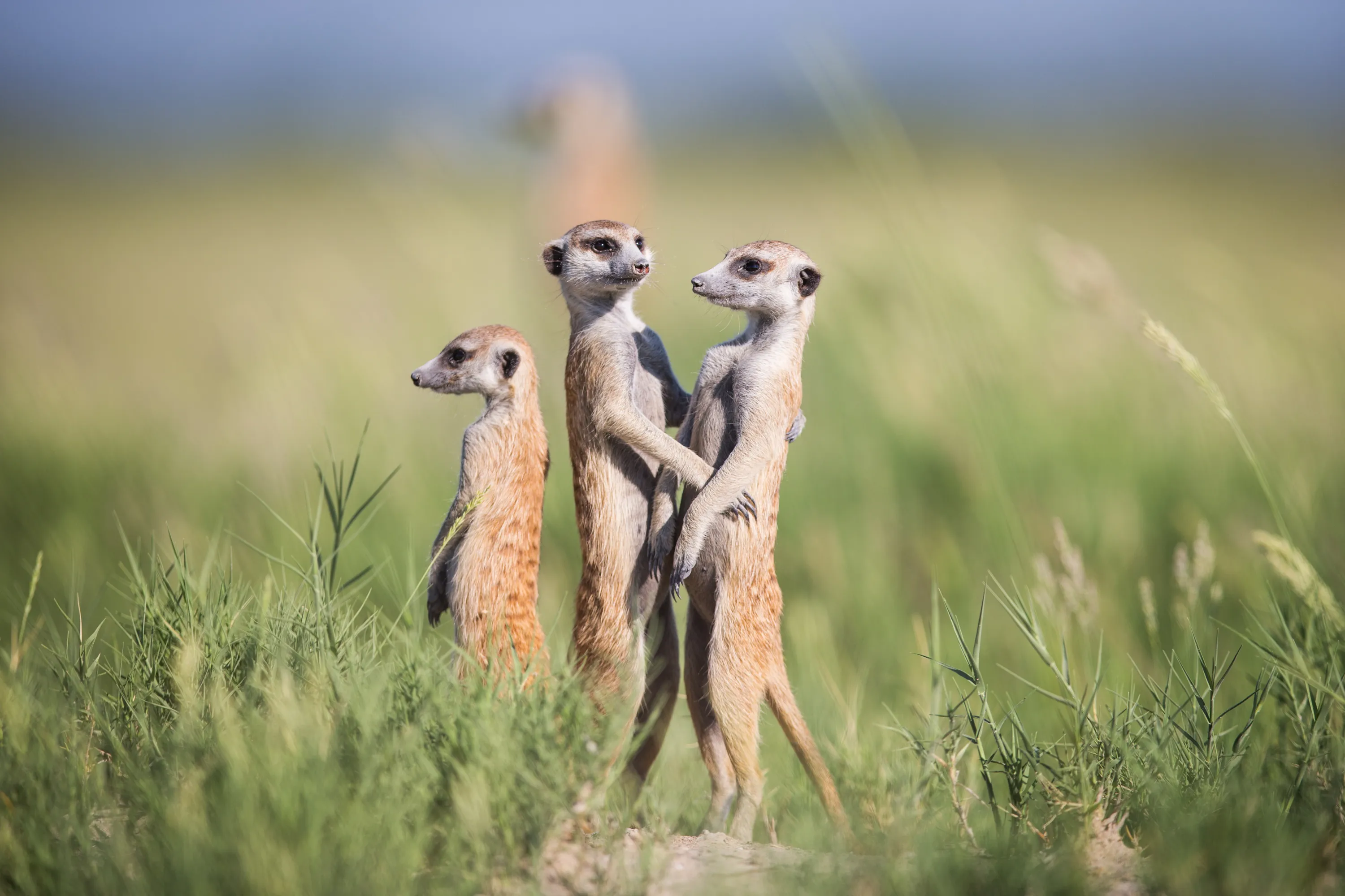 A family of Meerkats scouting for predators on January 2014 in Makgadikgadi, Botswana. These adorable Meerkats used a photographer as a look out post before trying their hand at taking pictures. The beautiful images were caught by wildlife photographer Will Burrard-Lucas after he spent six days with the quirky new families in the Makgadikgadi region of Botswana. Will has photographed Meerkats in the past and was delighted when he realised he would be shooting new arrivals. (Photo by Will Burrard-Lucas/Barcroft Media)