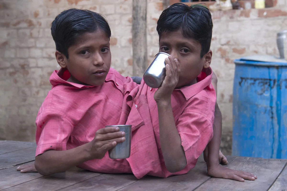 Conjoined twins Shivanath and Shivram Sahu have found a remarkable way to get to school – dropping to the floor and running like a spider.