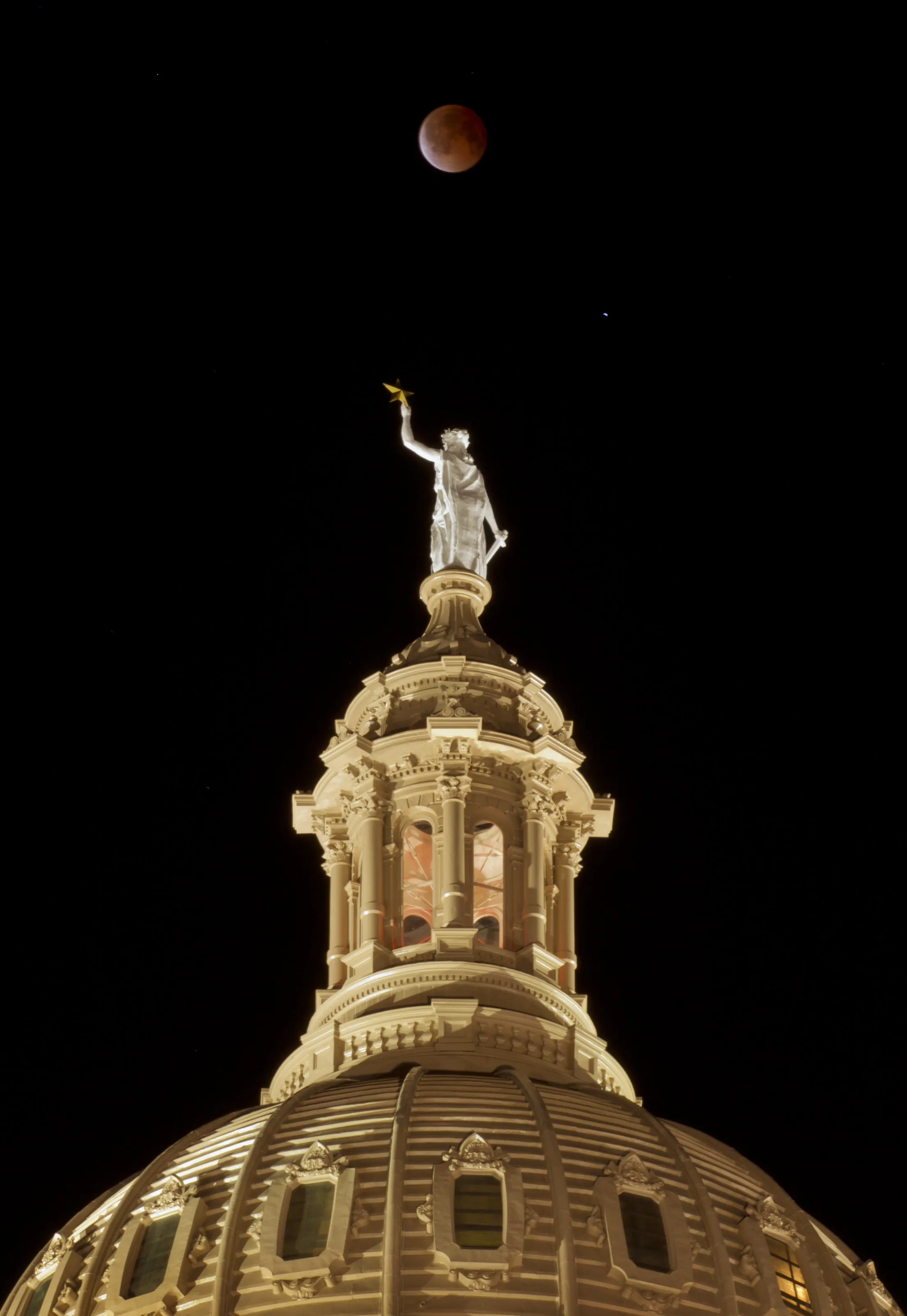 The moon glows a red hue over the Goddess of Liberty statue atop the Capitol in Austin, Texas, during a total lunar eclipse Tuesday, April 15, 2014. Tuesday's eclipse is the first of four total lunar eclipses that will take place between 2014 to 2015. (Photo by Jay Janner/AP Photo/Austin American-Statesman)