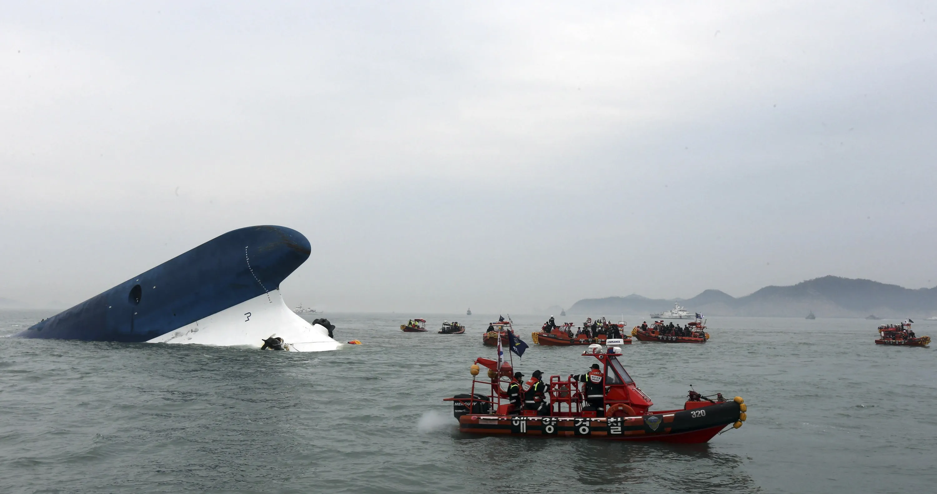 Part of South Korean passenger ship “Sewol” that has been sinking is seen as South Korean maritime policemen search for passengers in the sea off Jindo April 16, 2014. More than 100 people remained missing on Wednesday after a South Korean ferry with 477 people aboard capsized off the country's southwest coast, Yonhap news agency said. (Photo by Hyung Min-woo/Reuters/Yonhap)