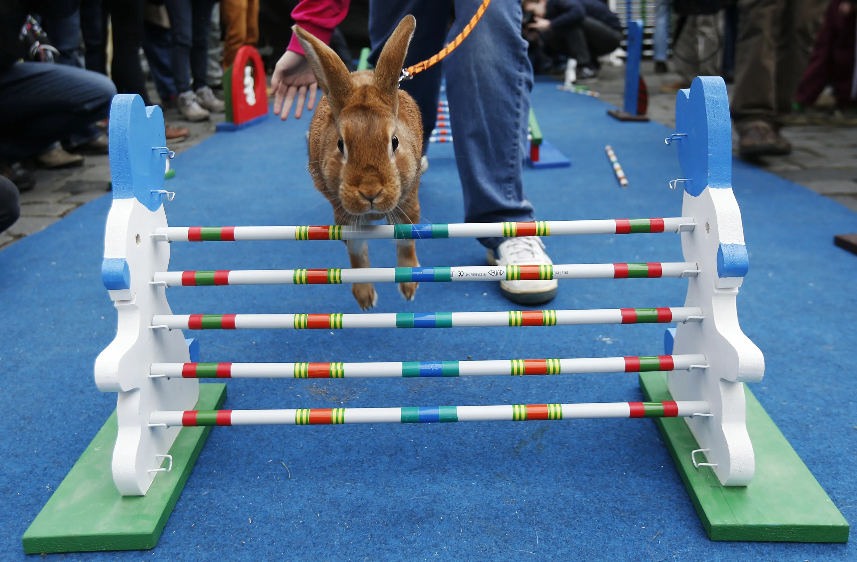 A rabbit leaps over an obstacle during a bunny hop competition at the Old Town Square in Prague, Czech Republic, Monday, April 14, 2014. (Photo by Petr David Josek/AP Photo)