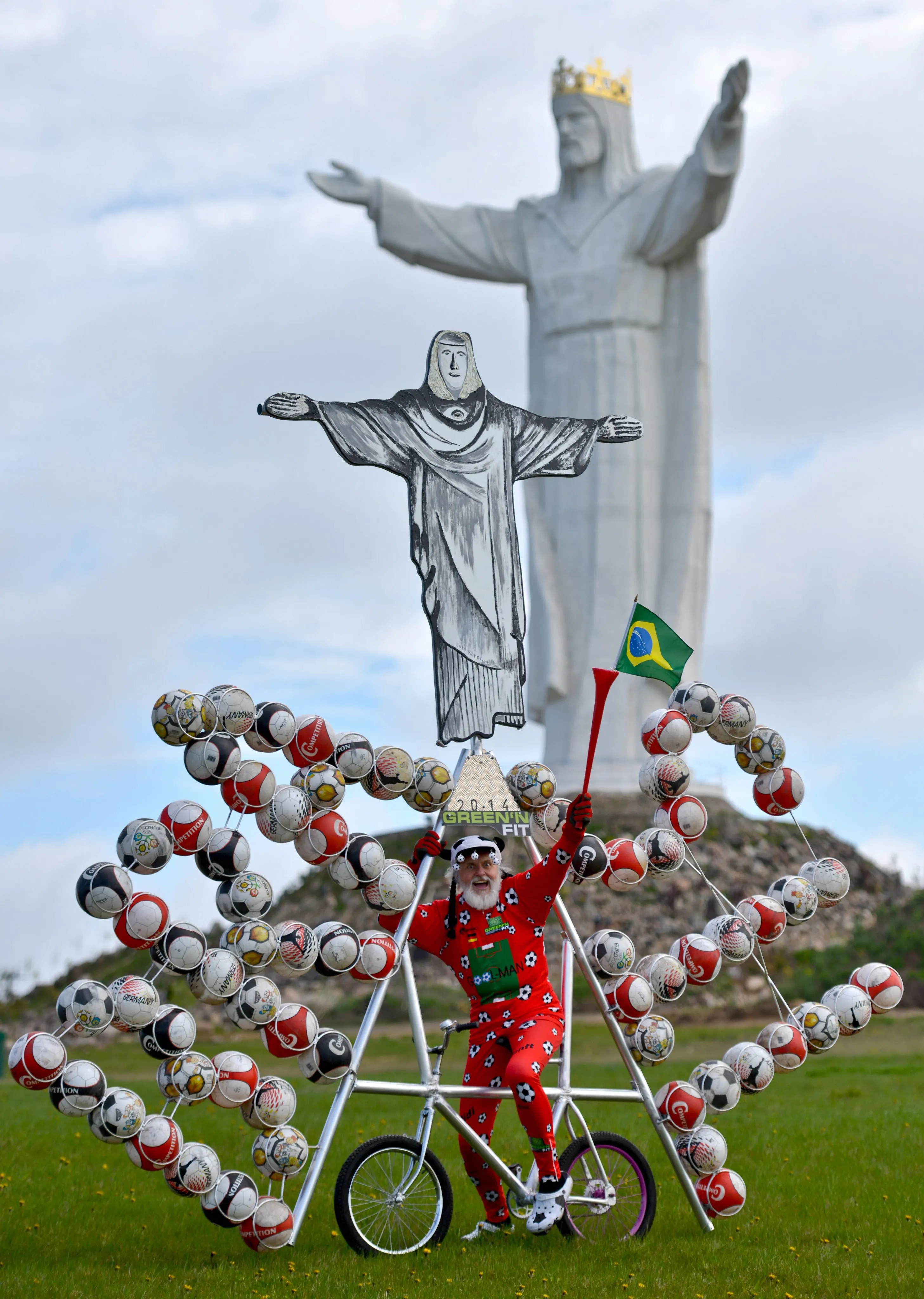 Bicycle designer Dieter 'Didi' Senft poses for photographs as he presents his soccer bicycle for the Soccer World Cup in Brazil in Swiebodzin, Poland, 15 April 2014. The designer from Brandenburg has designed a bicycle incorporating a copy of the statue Christ the Redeemer in Rio de Janeiro and 72 soccer balls. There is a statue of Jesus in Swiebodzin which is six metres higher than the one on Rio de Janeiro. (Photo by Patrick Pleul/EPA)