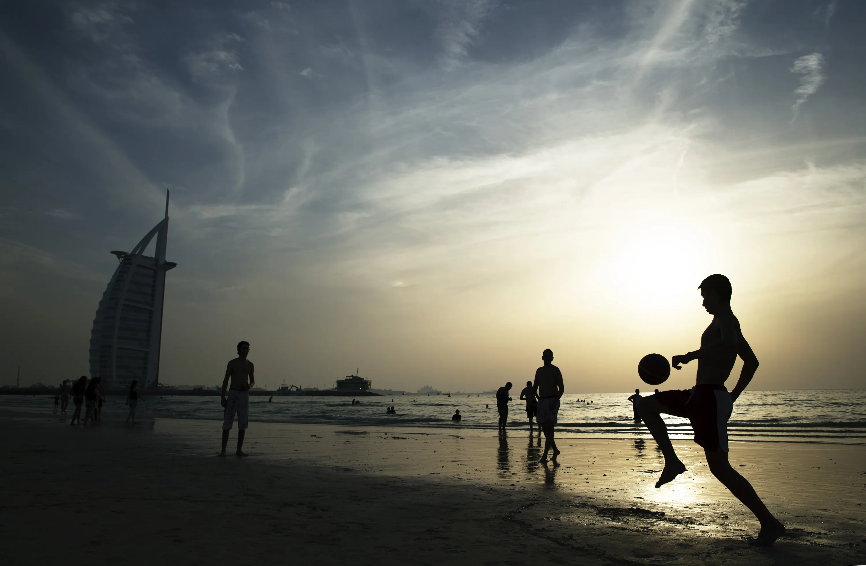 People enjoy Umm Suqeim Beach near the luxury Burj Al Arab Hotel on April 17, 2014 in Dubai, United Arab Emirates. (Photo by Warren Little/Getty Images)