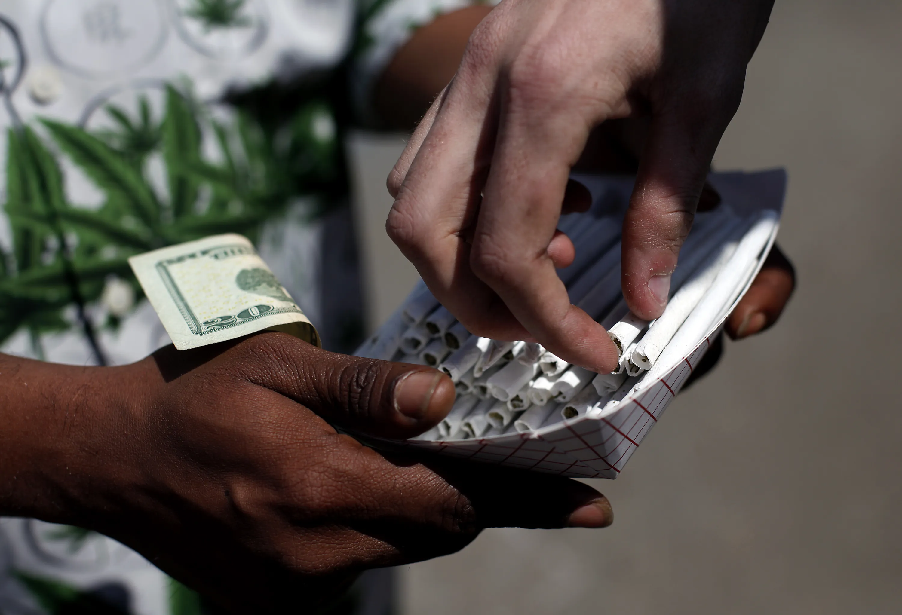 An entrepreneur sells pre-rolled joints during 420 celebrations at Hippie Hill in Golden Gate Park in San Francisco, Calif., on Sunday, April 20, 2014. (Photo by Sarah Rice/AP Photo/San Francisco Chronicle)