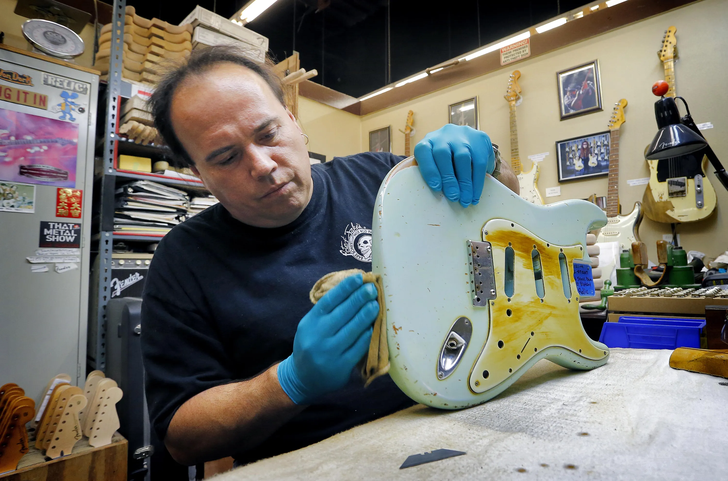 Fender Custom Shop Master Builder John Cruz works on a heavily-used Fender Stratocaster body at the Fender factory in Corona, Calif. on Tuesday, October 15, 2013. Leo Fender developed the instrument in a small workshop in Fullerton, Calif. six decades ago. (Photo by Matt York/AP Photo)