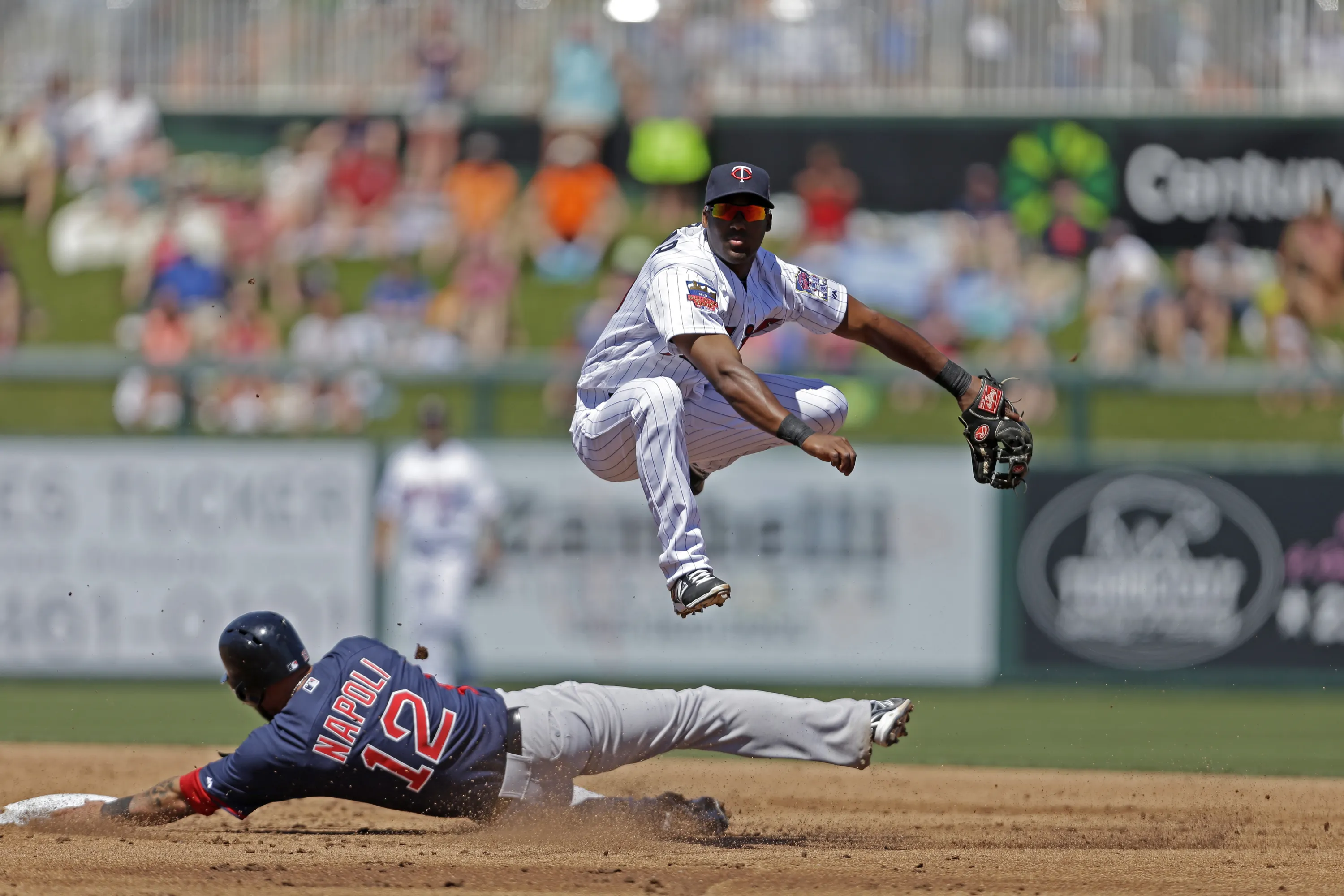 Boston Red Sox Mike Napoli (12) is forced out at second as Minnesota Twins shortstop Danny Santana (39) throws to first on a double play off the bat of A. J. Pierzynski in the second inning of an exhibition baseball game in Fort Myers, Fla., Thursday, March 13, 2014. (Photo by Gerald Herbert/AP Photo)