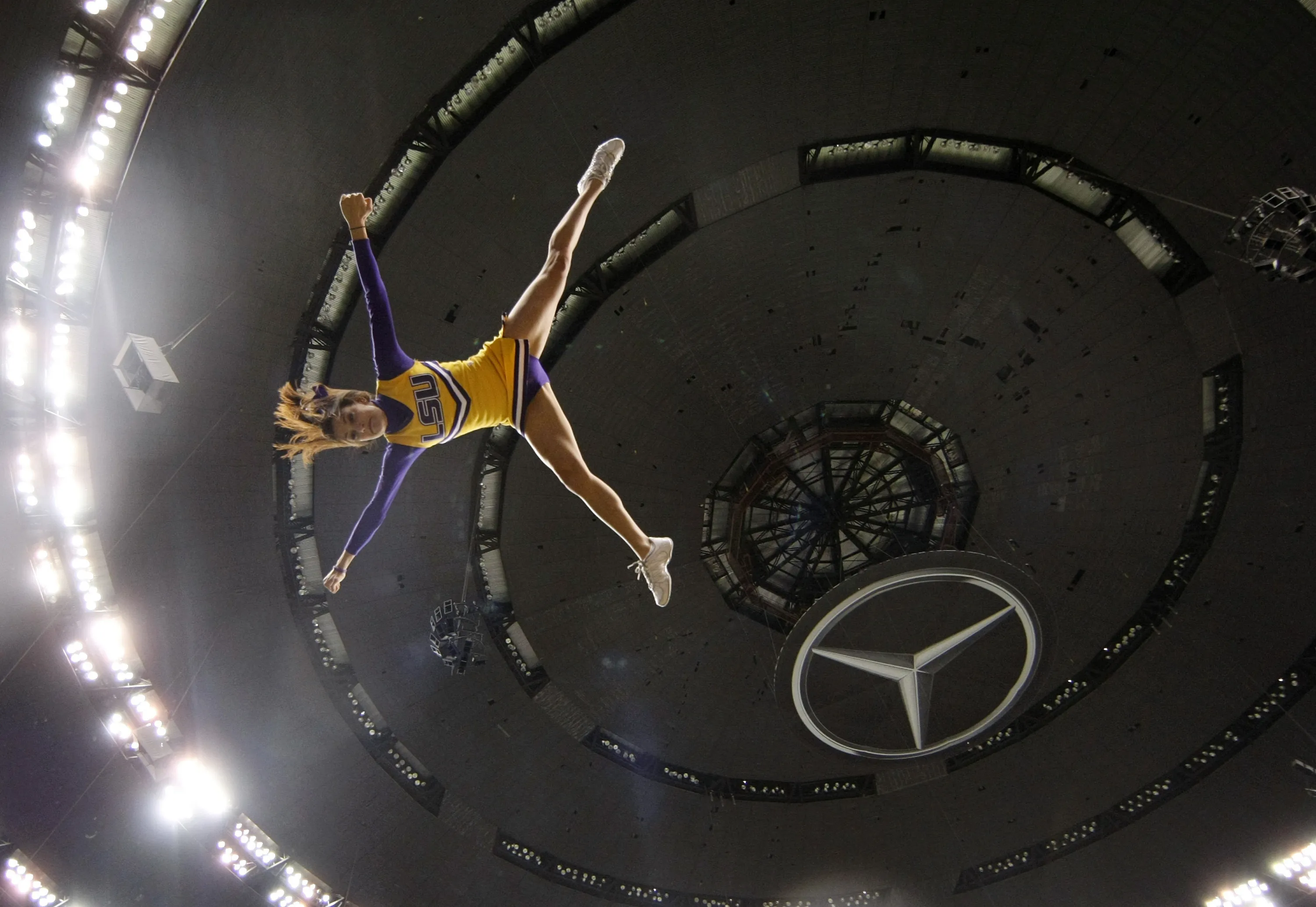 An LSU cheerleaders is flipped before the BCS National Championship college football game against Alabama Monday, January 9, 2012, in New Orleans. (Photo by Gerald Herbert/AP Photo)