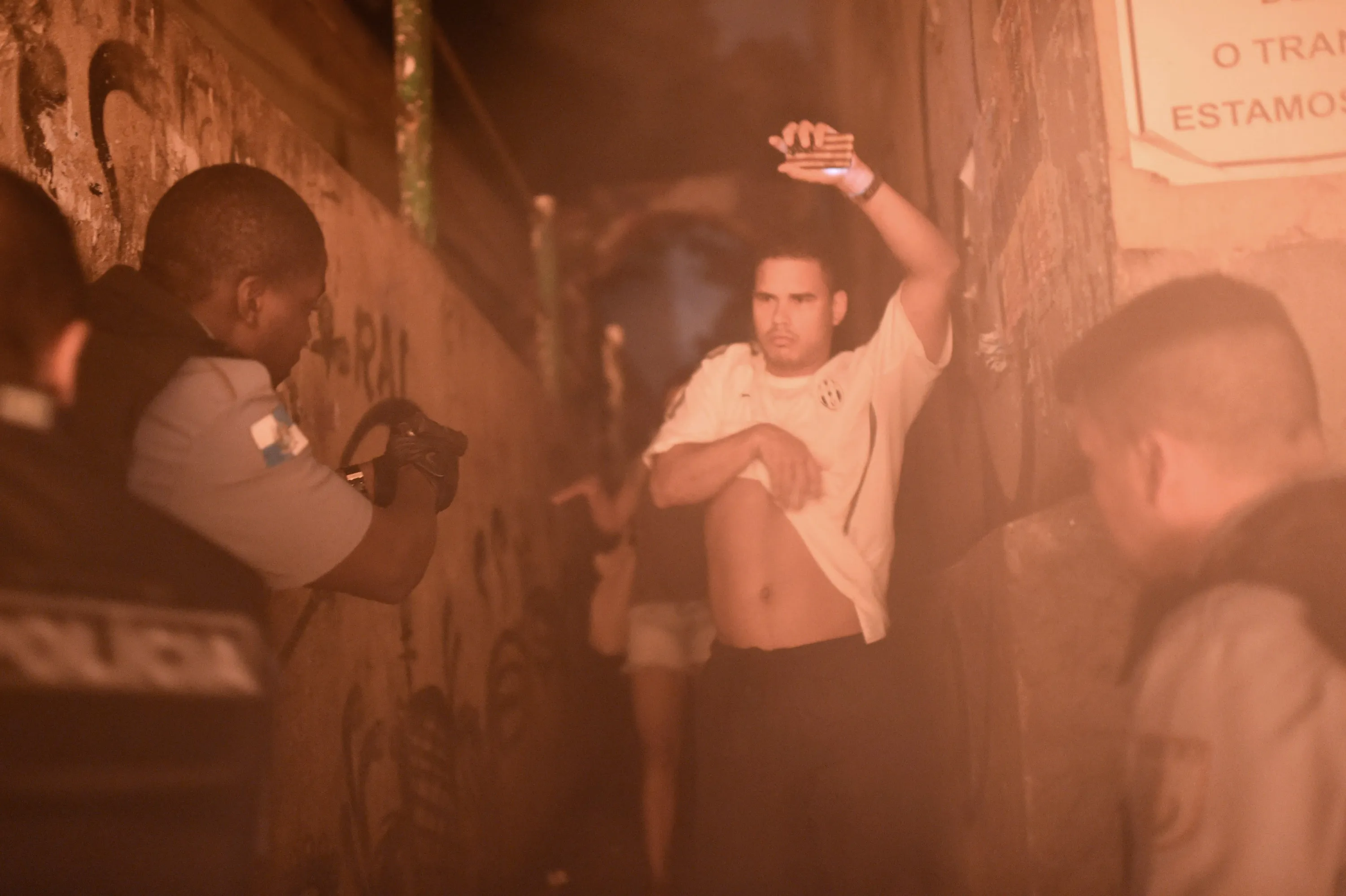 Brazilian Police Special Force members detain a man during a violent protest in a favela near Copacabana in Rio de Janeiro, Brazil on April 22, 2014. Violent protests broke out in Rio's landmark beachfront district, Copacabana, following the death of a resident last weekend during clashes with the Army in a nearby favela. (Photo by Christophe Simon/AFP Photo)