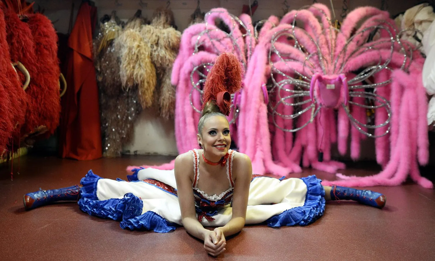 A dancer of the Moulin Rouge cabaret stretches prior to a show on April 22, 2014 in Paris. Since 1945, the "Maison Clairvoy" is specialised in the creation of luxury shoes and started in 1960 a collaboration with the famous Moulin Rouge to create boots and shoes for French Cancan dancers. (Photo by Franck Fife/AFP Photo)