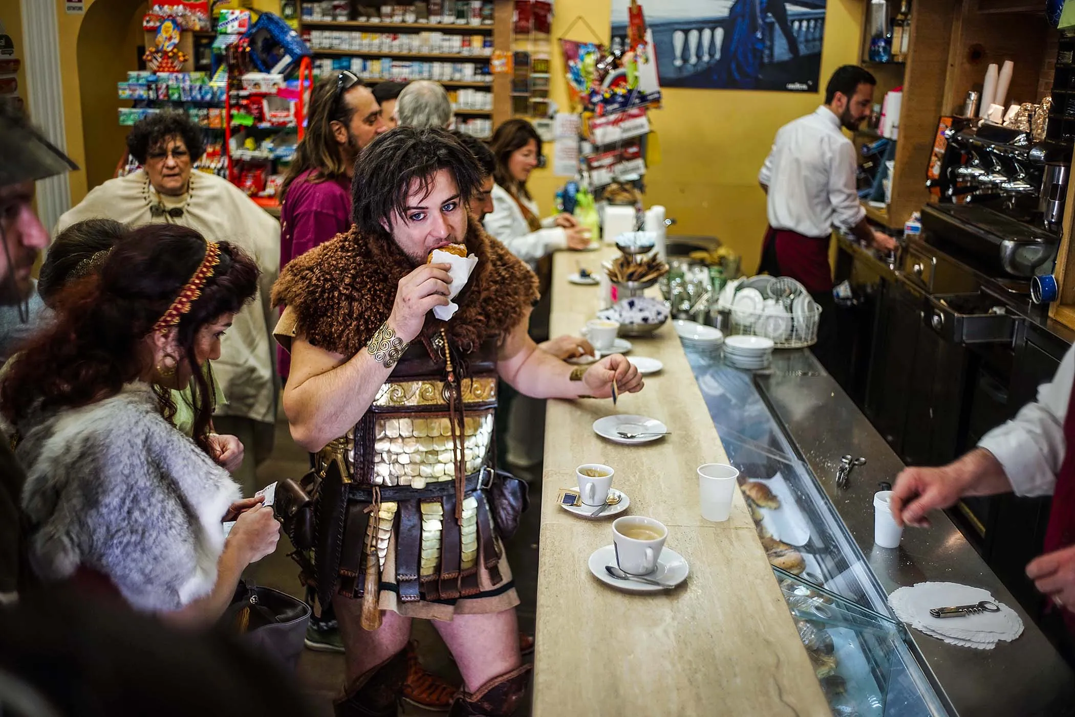 A man dressed in a traditional ancient Roman costume eats breakfast in a cafe before a parade along the ancient Roman ruins of the Colosseum, Circus Maximus and the Roman Forum to celebrate the festivities of the Christmas of Rome, on April 21, 2014. Legend says that Rome was founded by Romulus on April 21, 753 BC in an area surrounded by seven hills. Every year the city celebrates the Birth of Rome with parades and fighting in costume, re-enacting the deeds of the great ancient Roman Empire. (Photo by Andrew Medichini/Associated Press)