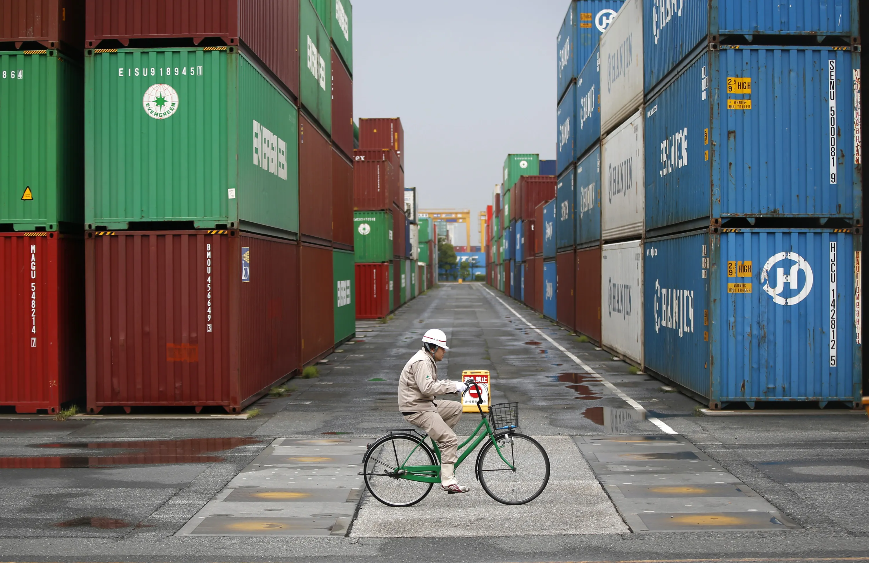 A worker rides a bicycle in a container area at a port in Tokyo April 21, 2014. Japan suffered its worst annual trade deficit in March as exports growth slowed to its weakest in a year, suggesting a rapid loss of economic momentum that may prompt policy makers into early action as a national sales tax hike puts more strain on growth. (Photo by Toru Hanai/Reuters)