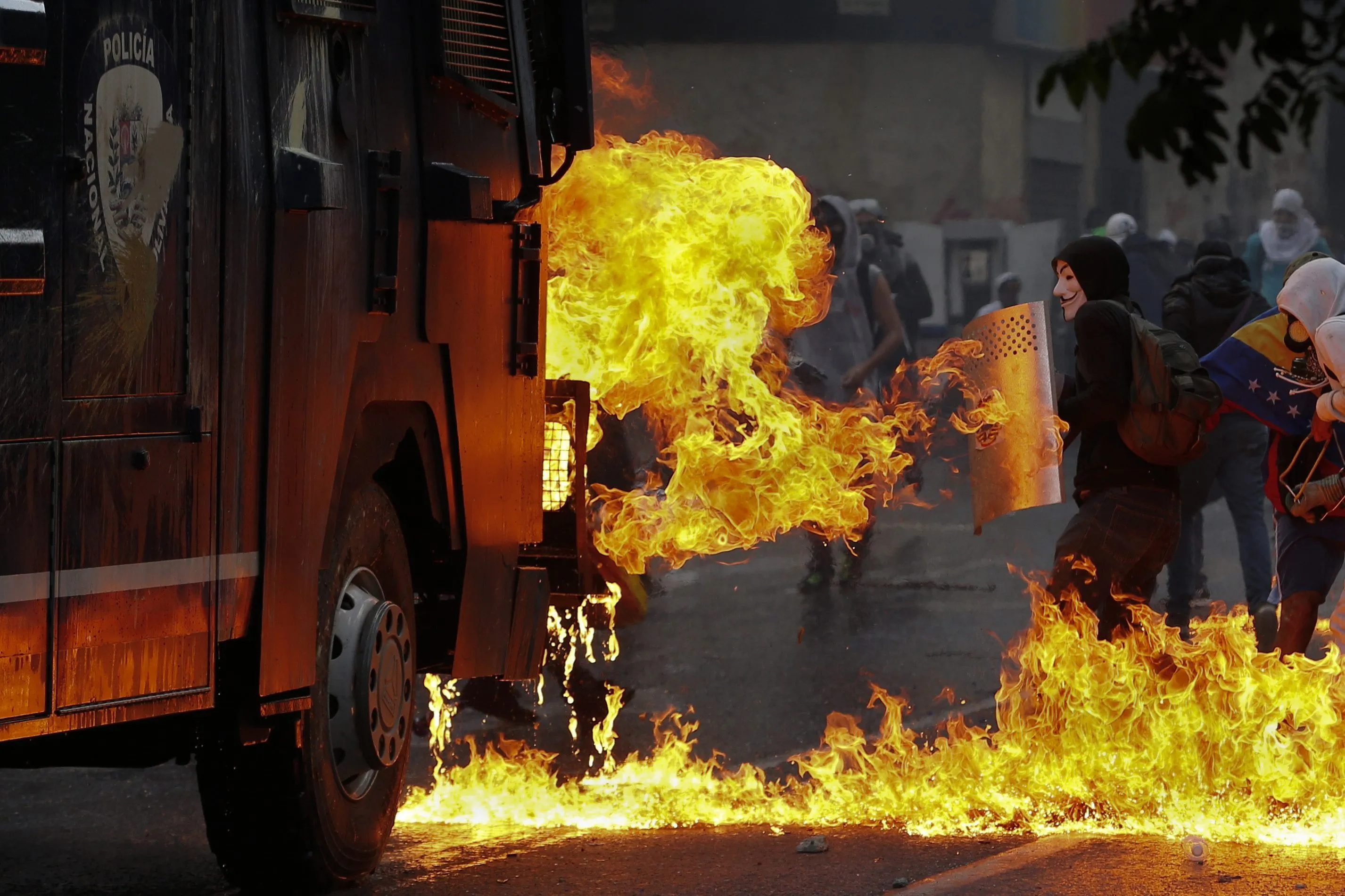 An anti-government protester, wearing a Guy Fawkes mask, stands with a shield near flames from Molotov cocktails during riots in Caracas, Venezuela, on April 20, 2014. Masked youths battled police and marchers demanded the “resurrection” of democracy on a volatile Easter Sunday in Venezuela. (Photo by Jorge Silva/Reuters)