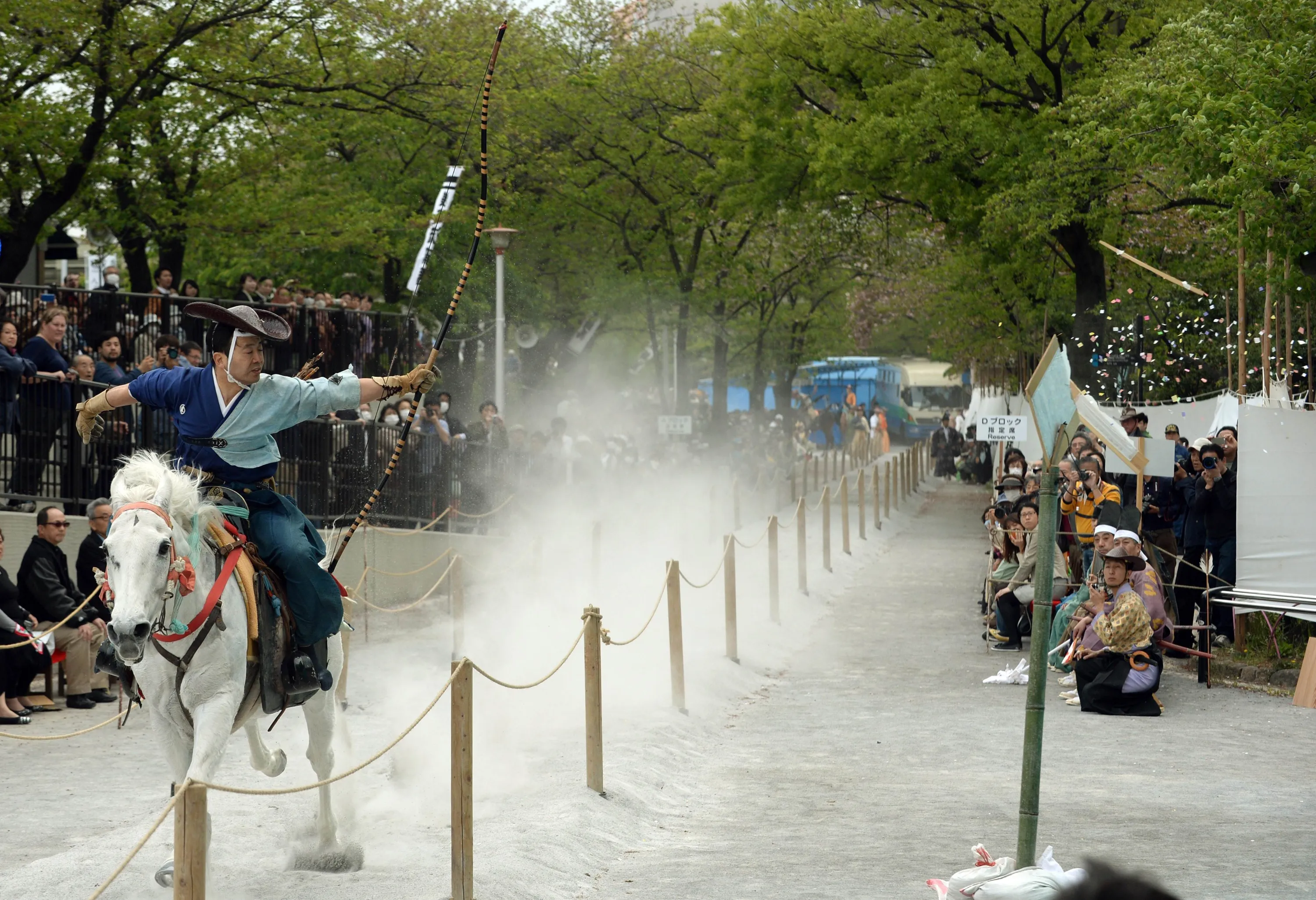 An archer wearing ancient samurai warrior dress shoots an arrow to a target while riding on horseback during a Yabusame demonstration of samurai martial arts in the 13th century in Tokyo on April 19, 2014. Yabusame is a form of mounted archery in traditional Japanese archery with an archer on a running horse shooting three arrows at wooden targets. (Photo by Toshifumi Kitamura/AFP Photo)