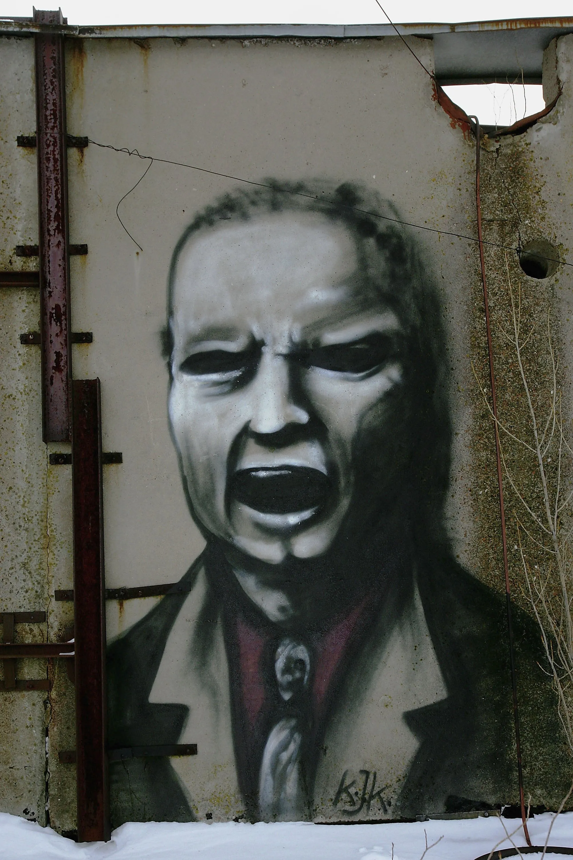 Graffiti is seen on the wall of a buidling on January 25, 2006 near Chernobyl, Ukraine. The town of Pripyat, deserted since the 1986 catastrophe, once housed 30,000 people, the majority of being workers from the Chernobyl Nuclear Power Plant. Days after the catastrophe the inhabitants were relocated to other locations in the Soviet Union. The town of Pripyat has remained uninhabited since. Prypyat and the surrounding area will not be safe for human habitation for several centuries. Scientists estimate that the most dangerous radioactive elements will take up to 900 years to decay sufficiently to render the area safe. (Photo by Daniel Berehulak/Getty Images)