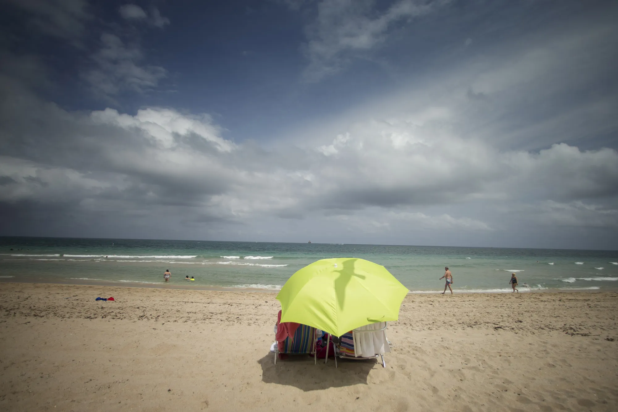 A seagull flies over a couple sunning inside a yellow umbrella on Fort Lauderdale, Fla., beach Wednesday, April 16, 2014, as approaching thunderstorms brew off shore. (Photo by J. Pat Carter/AP Photo)