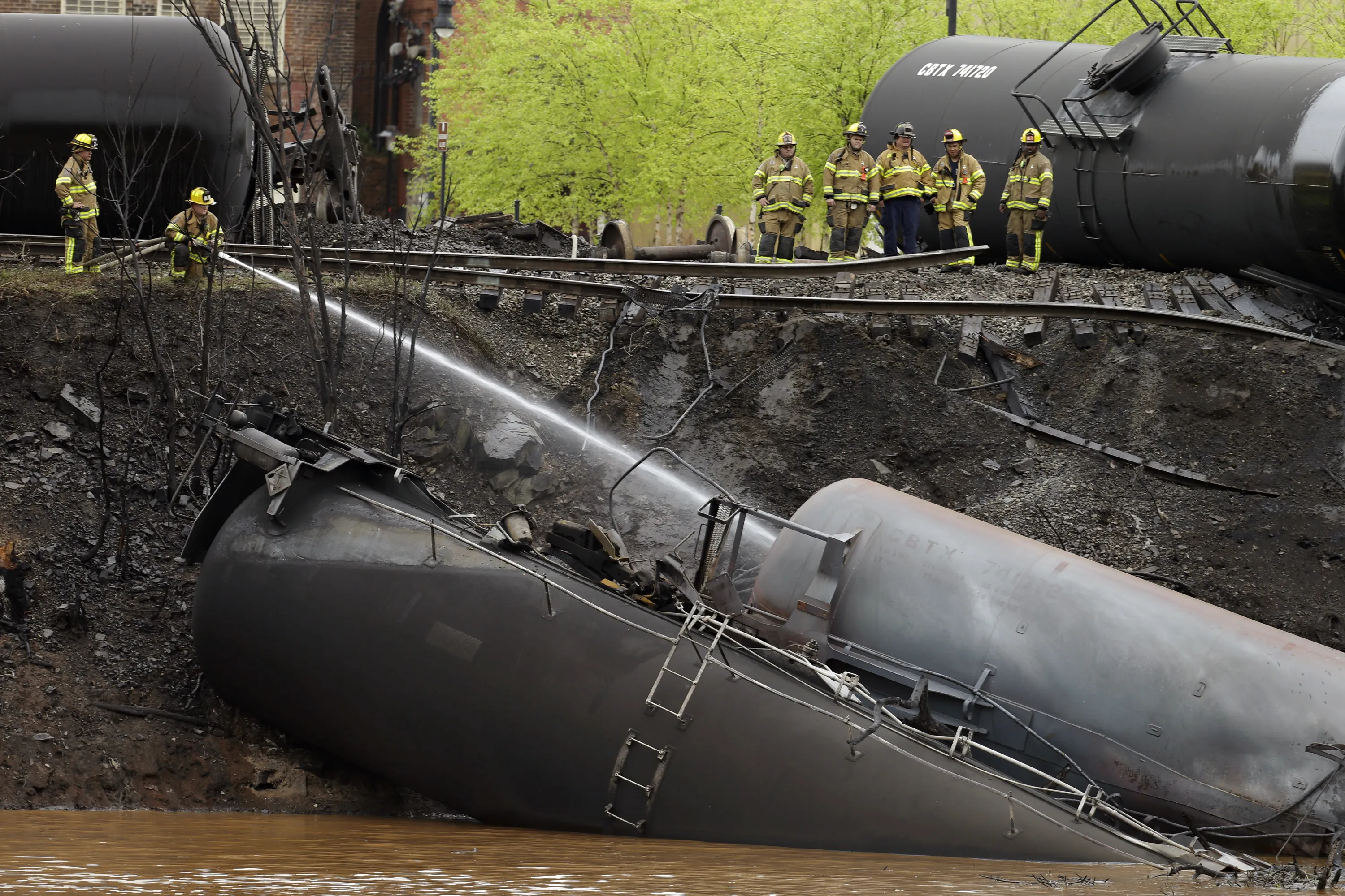 Firefighters and rescue workers work along the tracks where several CSX tanker cars carrying crude oil derailed and caught fire along the James River near downtown in Lynchburg, Va., Wednesday, April 30, 2014. Police said that more than a dozen tanker cars were involved in the derailment. (Photo by Steve Helber/AP Photo)