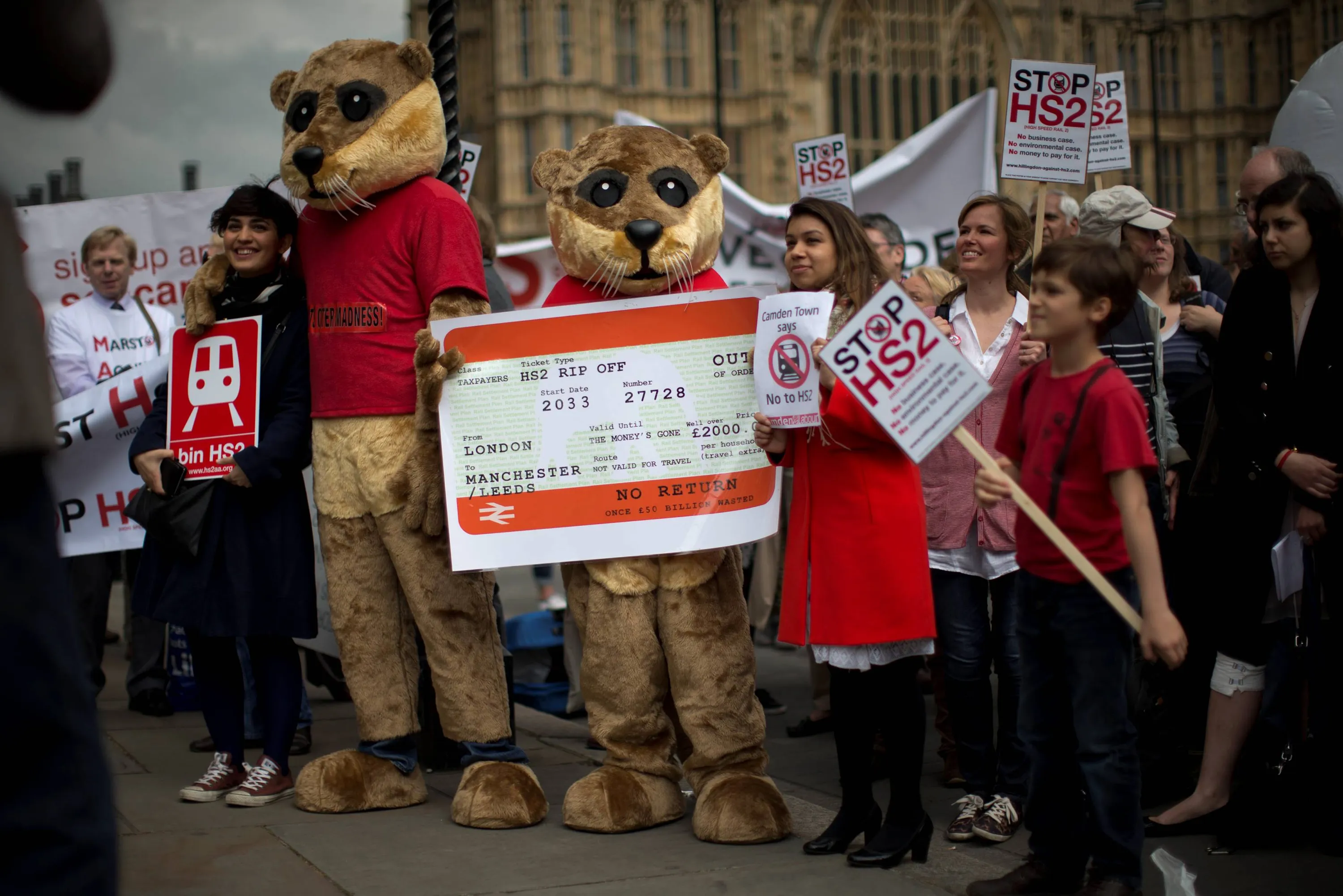 Campaigners against the construction of the proposed HS2 (High Speed 2) railway line, including two dressed up as otters, pose for photographs for the media with banners and an inflatable white elephant as they protest outside the Houses of Parliament in London, Monday, April 28, 2014. The protest was held Monday to coincide with a debate in Parliament on HS2. A white elephant is a term given to a scheme or object considered by some people to offer little value. (Photo by Matt Dunham/AP Photo)