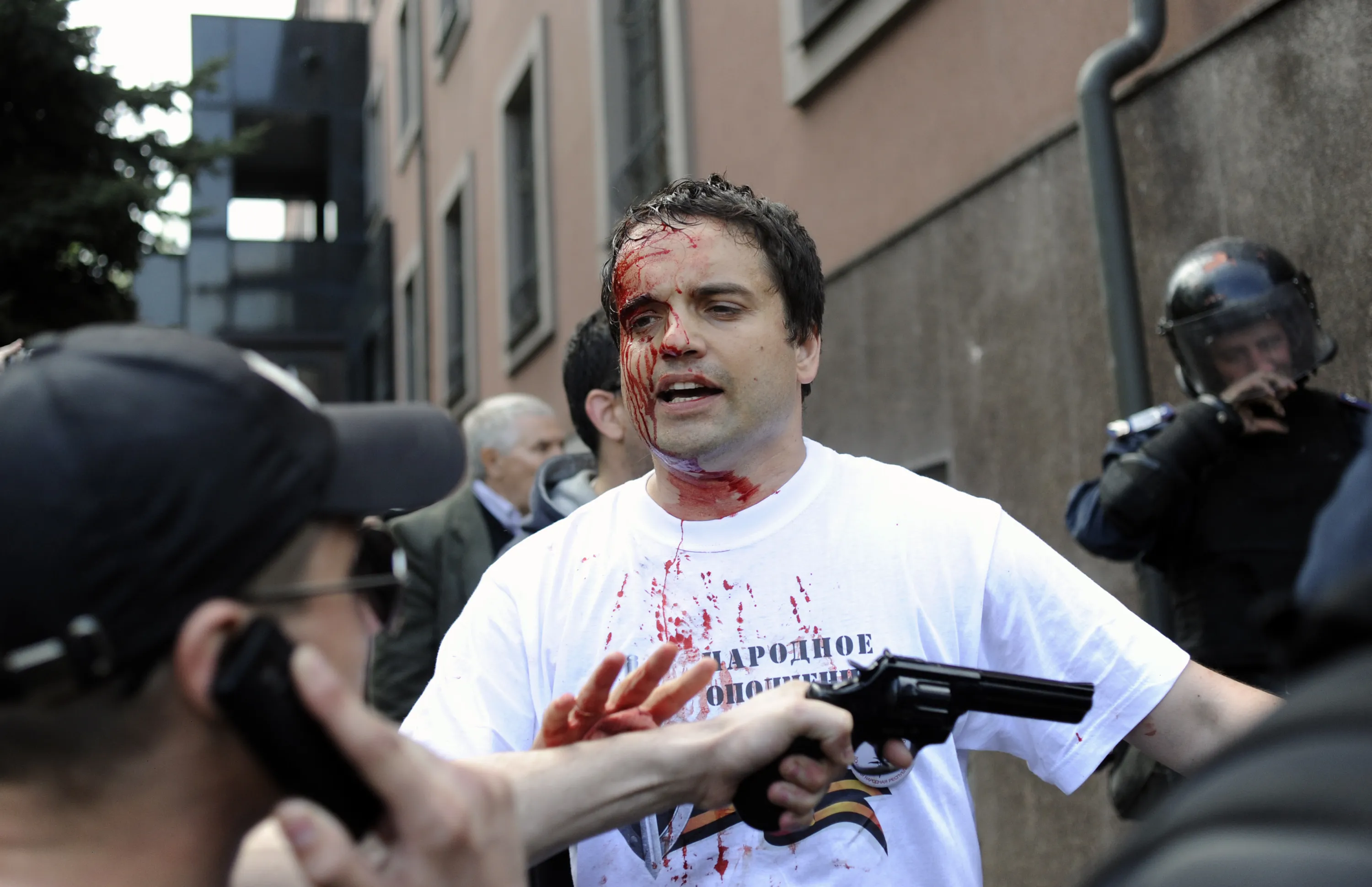 An injured Pro-Russian activist speaks with an armed protester during clashes with police in front of the regional administration building in Donetsk, Ukraine, Thursday, May 1, 2014. Anti-government demonstrators in Donetsk have stormed the local prosecutor's office. The clash came after a march by several hundred people carrying flags of the Donetsk People's Republic, a movement that seeks either greater autonomy from the central government, or independence and possible annexation by Russia. (Photo by Evgeniy Maloletka/AP Photo)