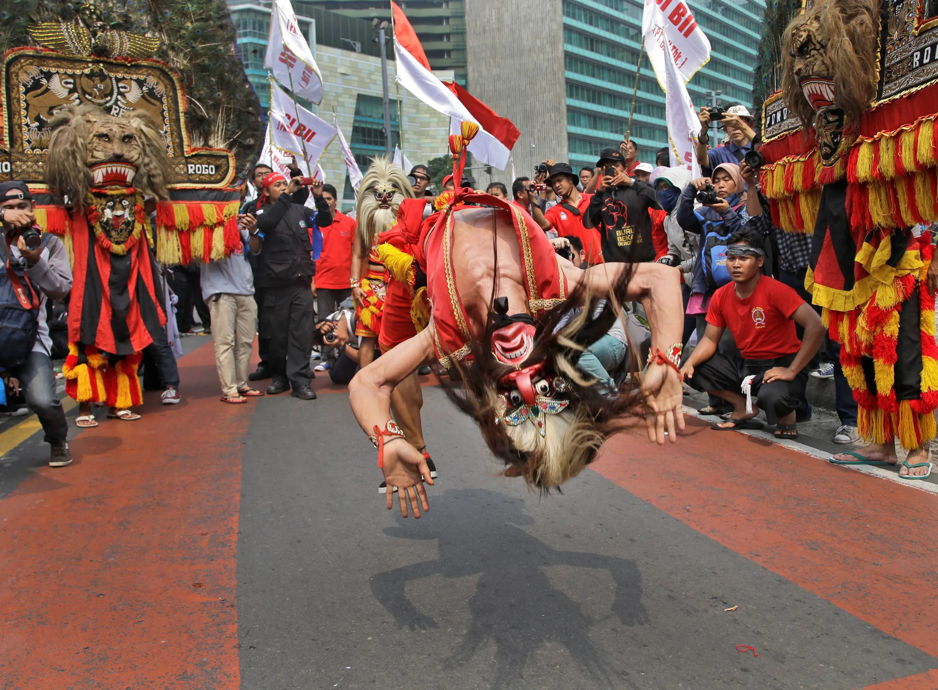 A masked dancer somersaults as he performs during a May Day rally in Jakarta, Indonesia, Thursday, May 1, 2014. (Photo by Dita Alangkara/AP Photo)