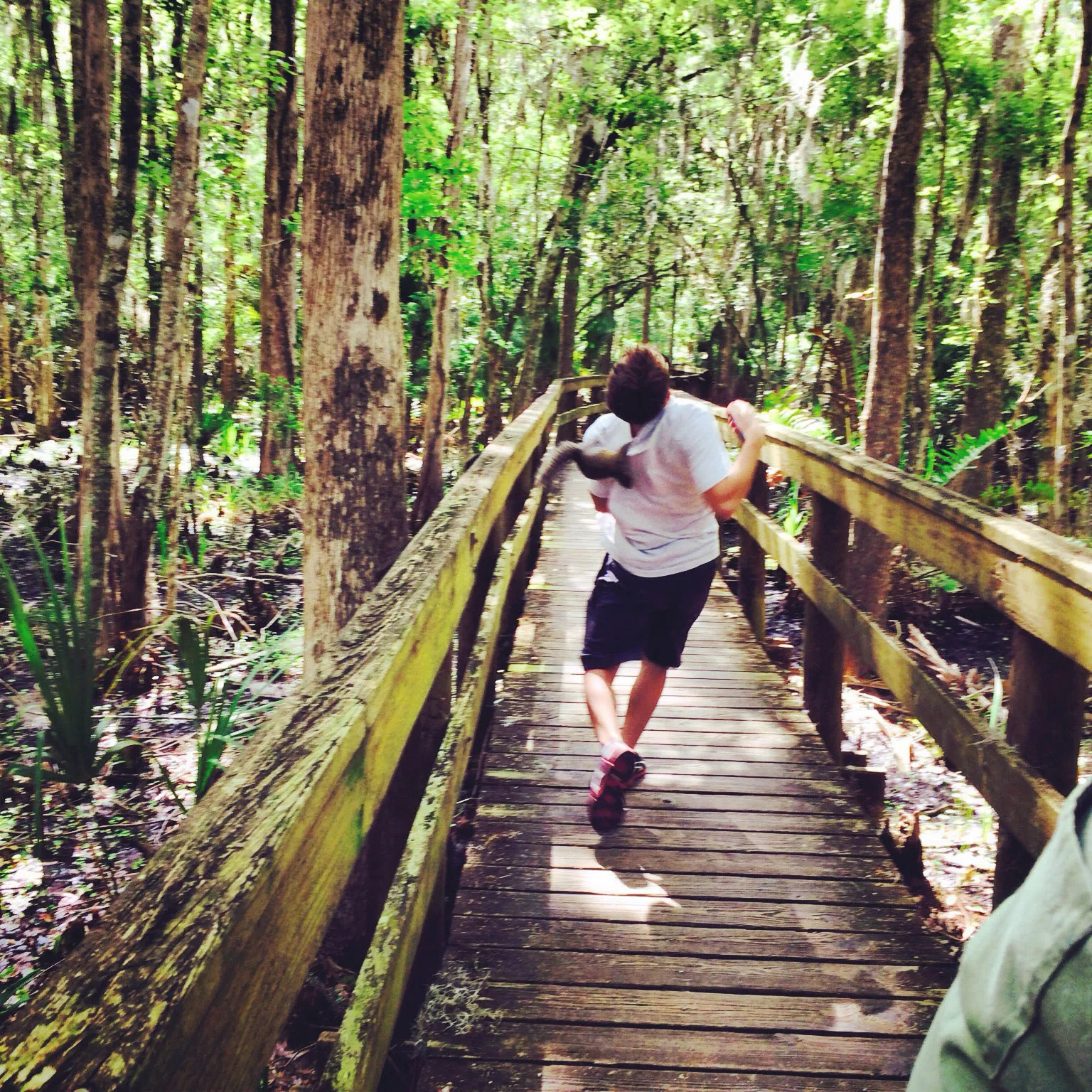 In this photo made Saturday April, 26, 2014, and provided by Brian Genest, a squirrel clings to the back of Brian Genest at John Chestnut Park near Tampa, Fla. Genest, 17, of Auburn, Maine, said the flash and noises from his camera phone scared the animal, which climbed under the teen's shirt and hung onto his back. “He was just in that spot where my arm can't reach him”, Genest said. “I threw myself on the ground and that scared him off”. (Photo by Paula Wright/AP Photo)