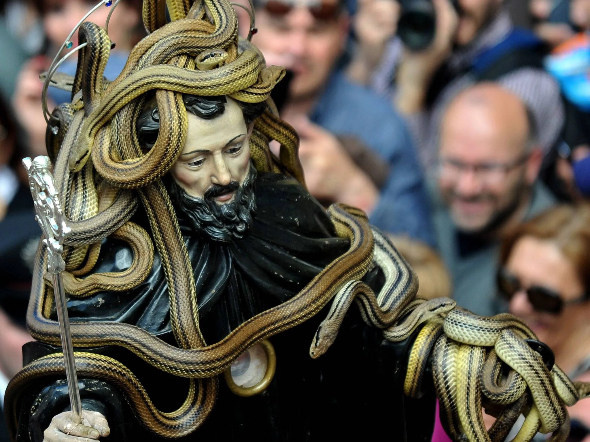 A statue of Saint Domenico covered with live snakes is carried by the faithful during an annual procession in the streets of Cocullo, in the Abruzzo region, on May 1st, 2014. (Photo by Tiziana Fabi/AFP Photo)