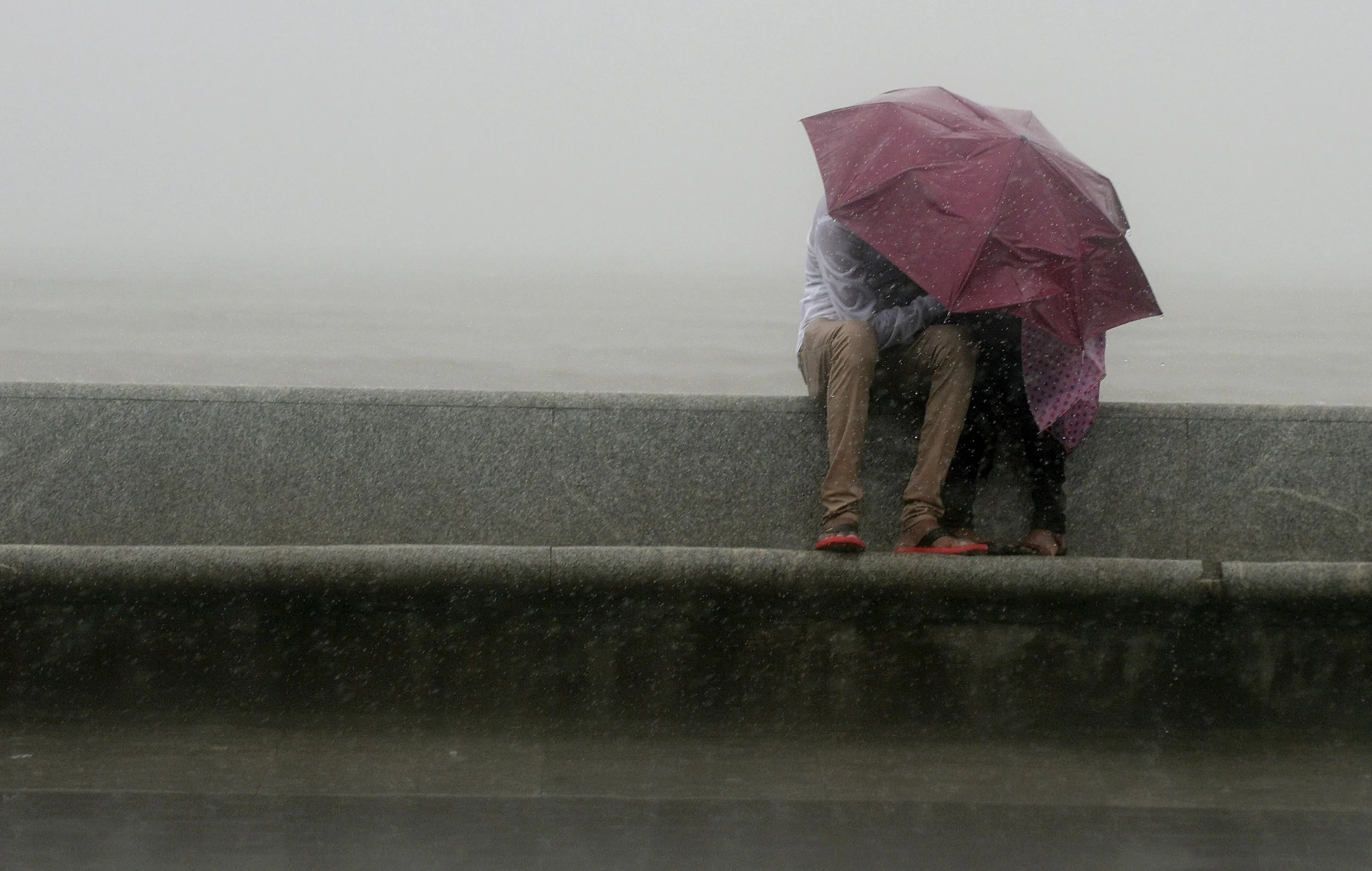 An Indian couple sit together under an umbrella during heavy rain showers at the sea front in Mumbai on July 12, 2013. The monsoon season, which runs from June to September, accounts for about 80 percent of India's annual rainfall, vital for a farm economy which lacks adequate irrigation facilities. (Photo by Punit Paranjpe/AFP Photo)