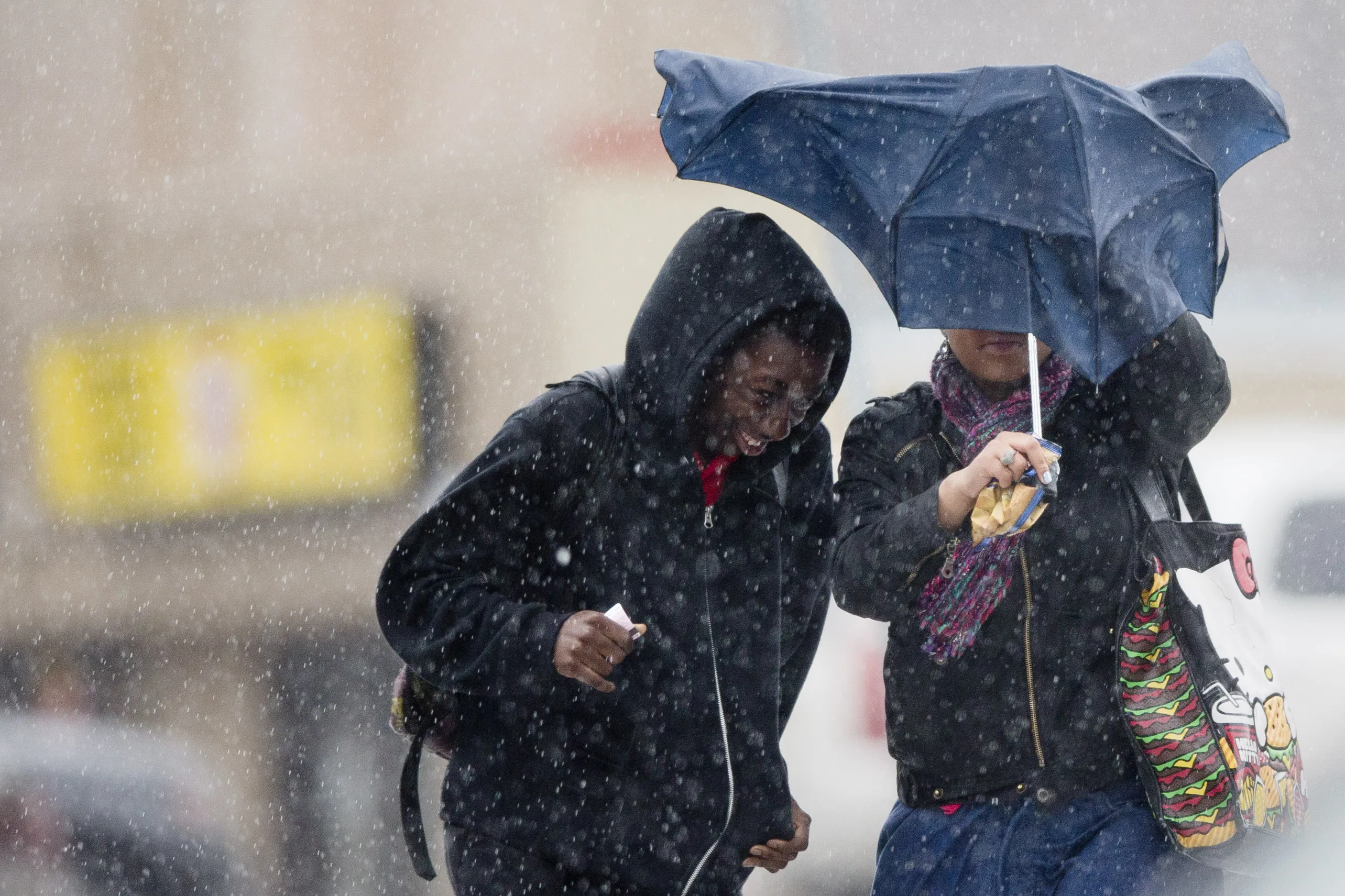 Pedestrians walk with little protection from their collapsed umbrella during a rainstorm, Wednesday, April 30, 2014, in Philadelphia. The area can expect widespread showers with possible thunderstorms with a flood watch in effect through Thursday morning. (Photo by AP Photo)